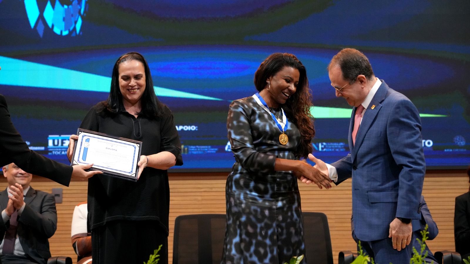 Durante a solenidade, foi realizada a outorga da medalha do mérito acadêmico “Feliciano Machado Braga” à reitora da Universidade Federal do Tocantins (UFT), doutora Maria Santana Milhomem, e ao desembargador Pedro Valls Feu Rosa, do Tribunal de Justiça do Espírito Santo (TJES).