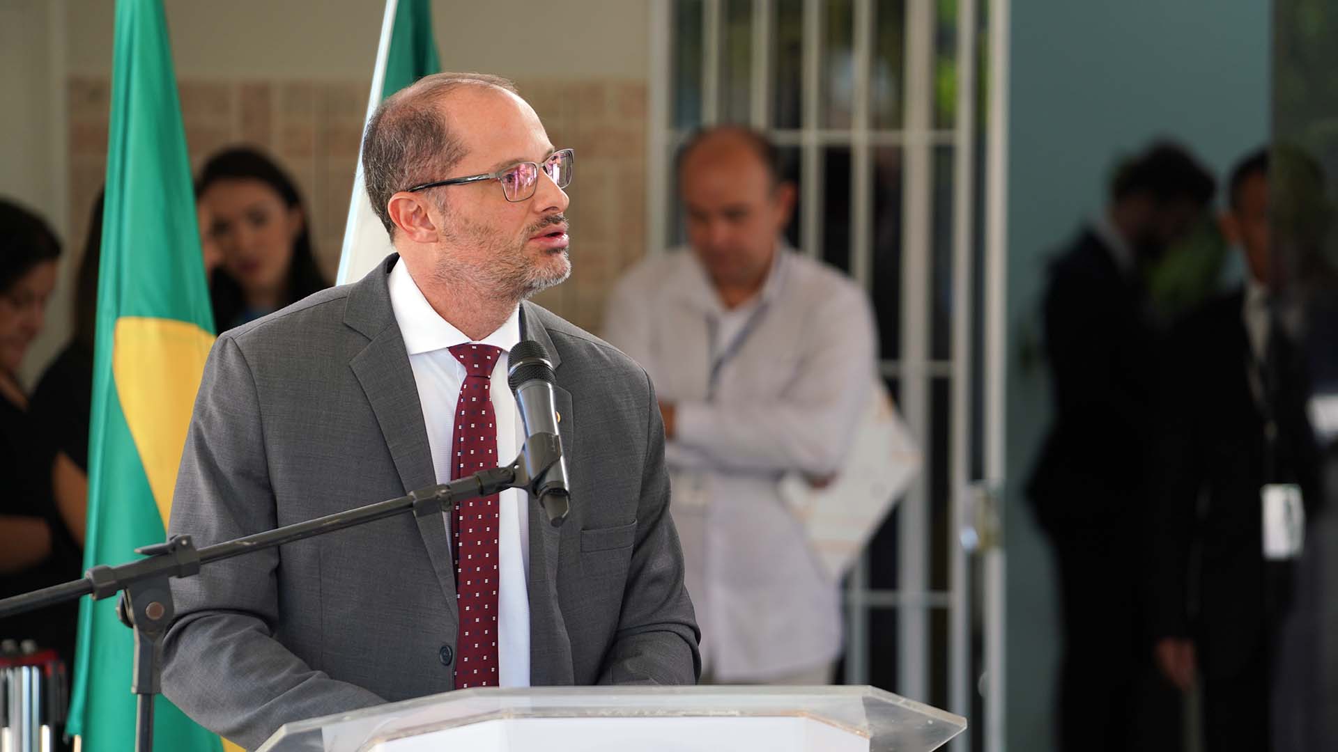 Desembargador João Rigo Guimarães, homem de cabelos e barba brancos, ele usa terno escuro, camisa branca e gravata com listras azuis, cinzas e brancas; ele fala ao microfone