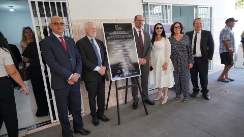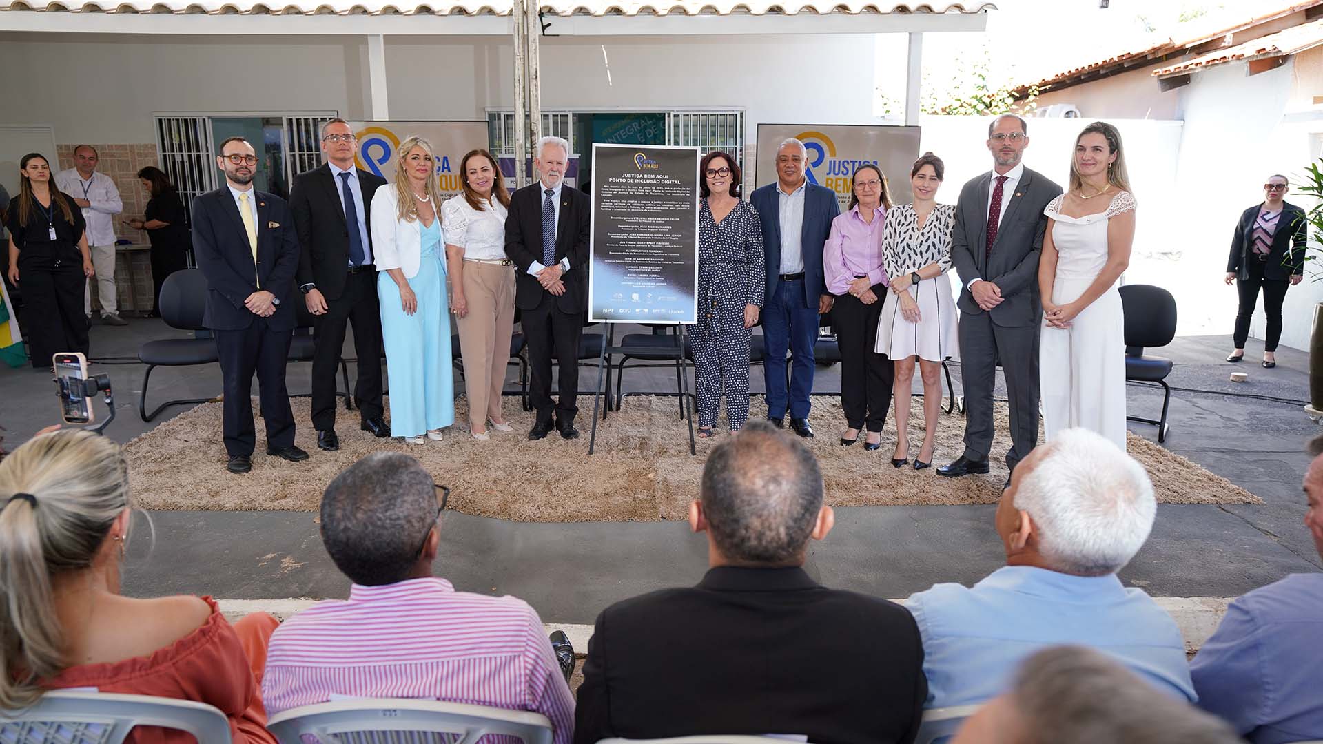 Fotos: Rondinelli Ribeiro Imagem aberta com a presidente do TJTO e demais autoridades parceiras em pé ao lado da placa de instalação do Justiça Bem Aqui - Ponto de Inclusão Digital