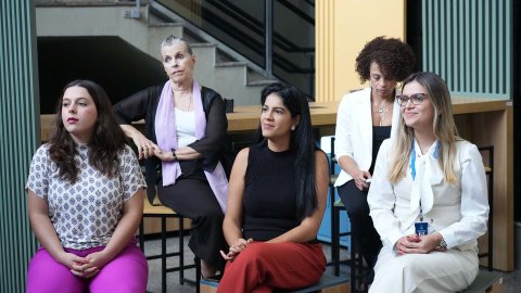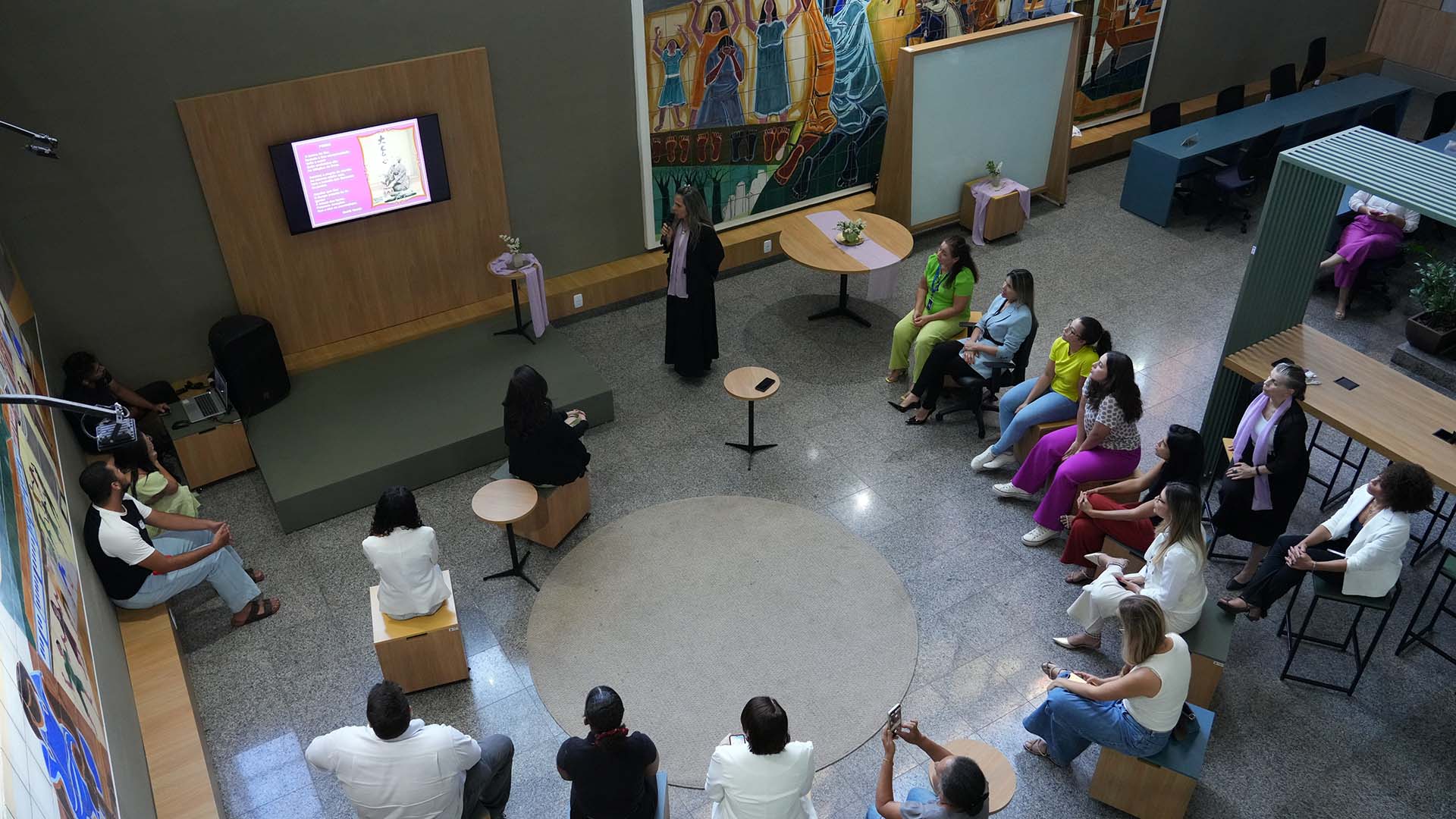 A foto mostra um grupo de mulheres reunidas em um espaço interno, organizado em forma de roda. Todas estão sentadas em bancos individuais de madeira, escutando atentamente uma mulher que fala em pé, segurando um microfone.