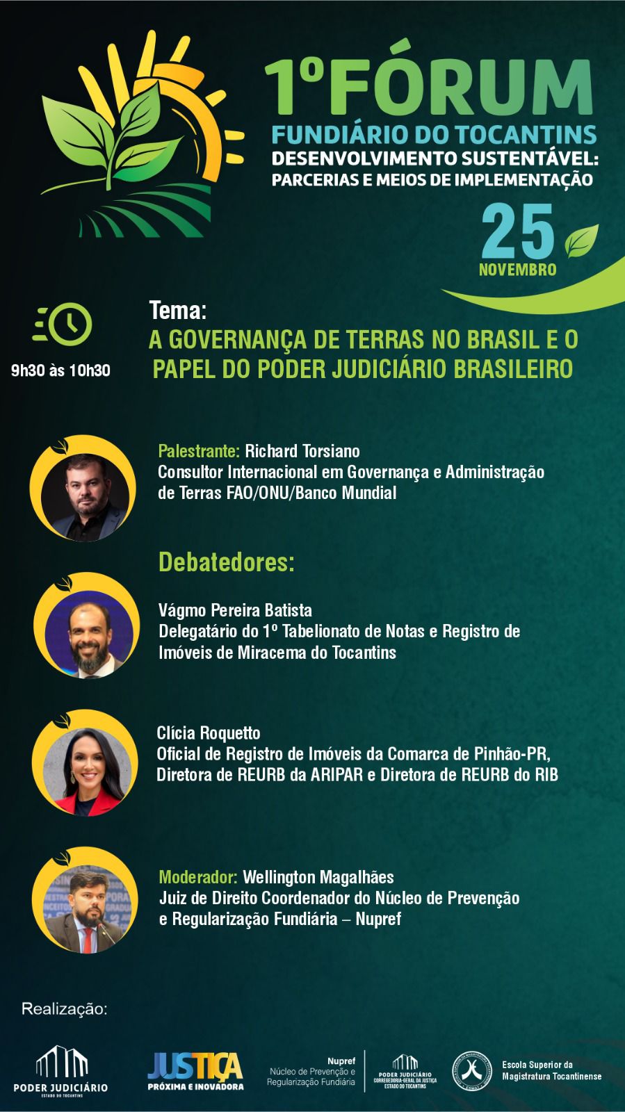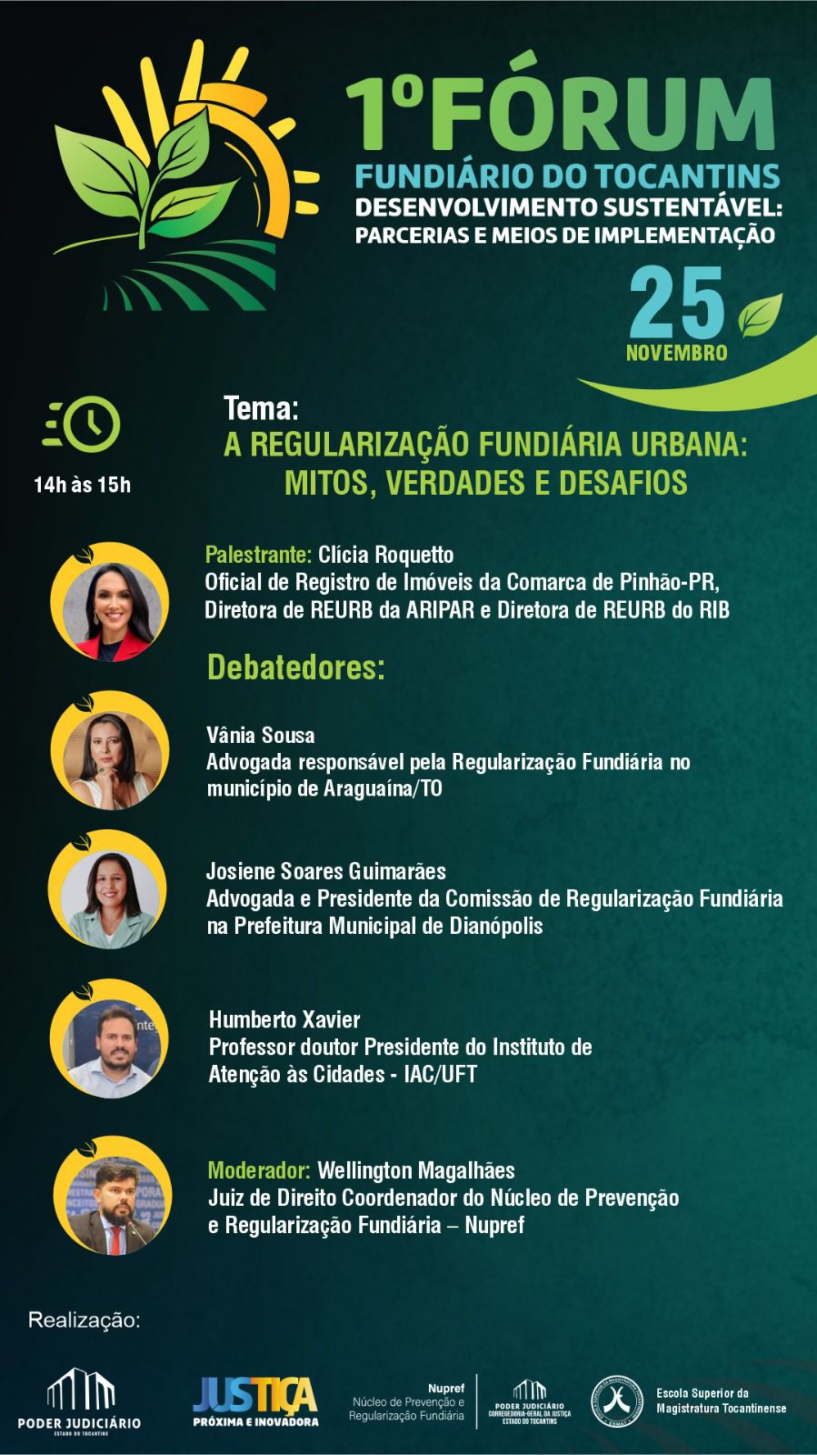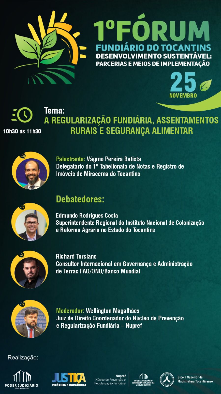 “Esse Fórum abrirá a Semana Nacional do Solo Seguro em nosso Estado e proporcionará o intercâmbio de boas práticas e troca de experiências entre as comissões de regularização fundiária dos mais de 100 municípios parceiros do Nupref. Também será uma oportunidade de diálogo e prestação de contas do trabalho que realizamos nos últimos anos”, ressaltou o juiz Wellington Magalhães, coordenador do Núcleo de Prevenção e Regularização Fundiária do Tocantins (Nupref/CGJUS).