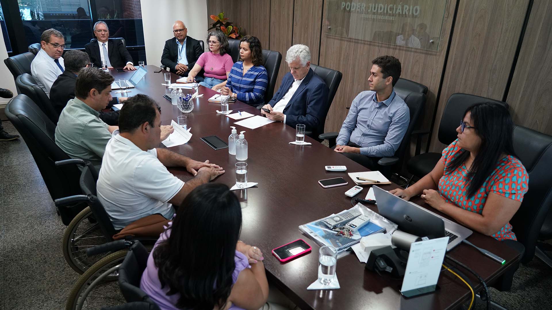 Rondinelli Ribeiro/Comunicação TJTO Ao redor de uma mesa marrom, com copos e papeis em cima, estão alguns diretores do TJTO e o desembargador Pedro Nelson de Mirando Coutinho no centro