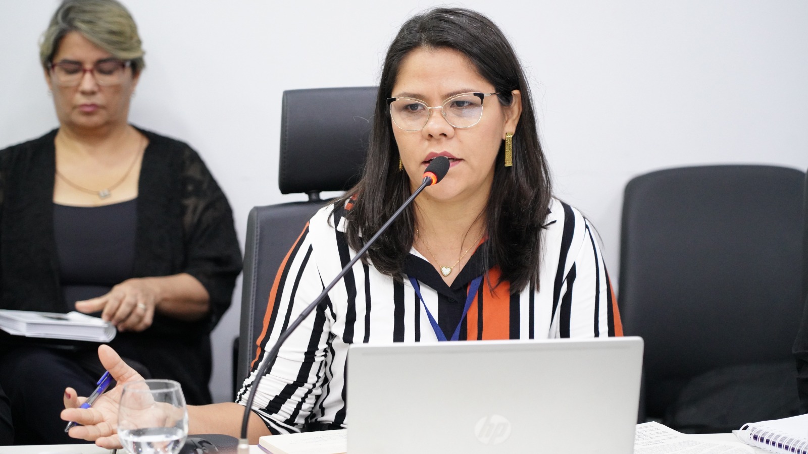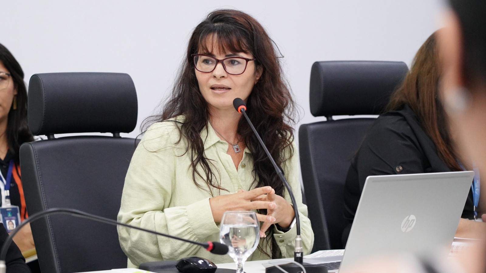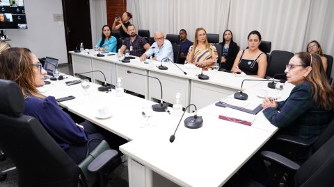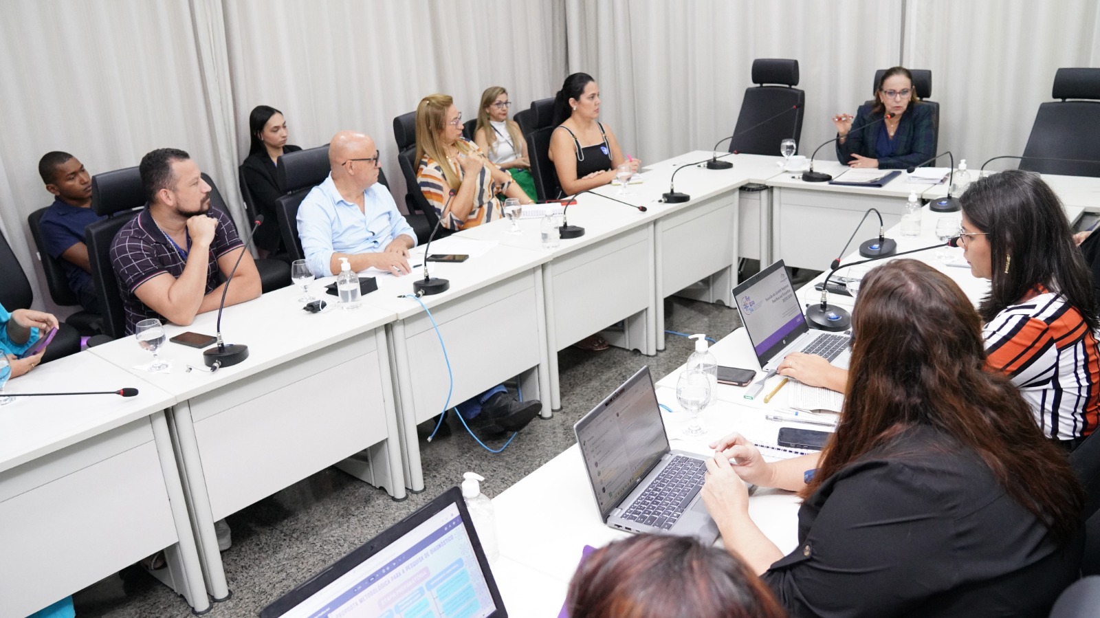 Elias Oliveira Sala de reunião com mesas dispostas em formato de “U”, onde cerca de 15 pessoas participam de um encontro. Ao centro, a desembargadora Ângela Prudente ocupa a posição principal da mesa. Os participantes estão sentados, alguns com notebooks abertos, celulares e blocos de anotação. Há microfones individuais sobre as mesas, copos de água e garrafas. O ambiente possui paredes claras, cortinas ao fundo e piso em granito.