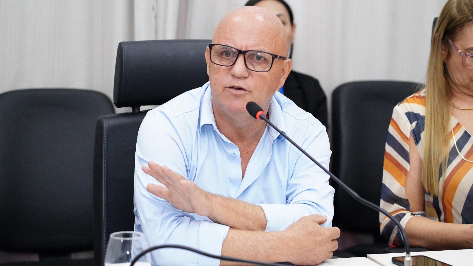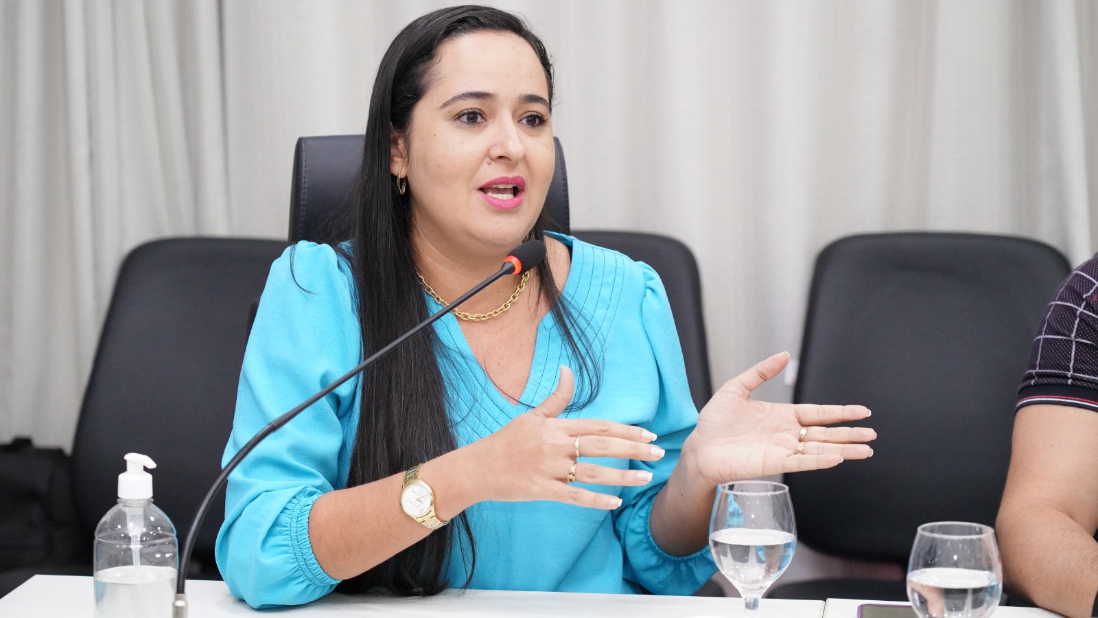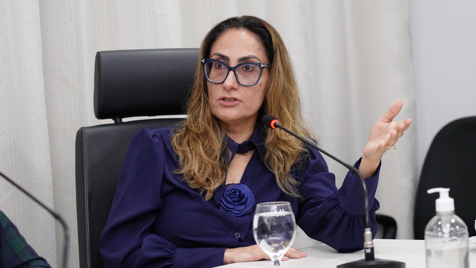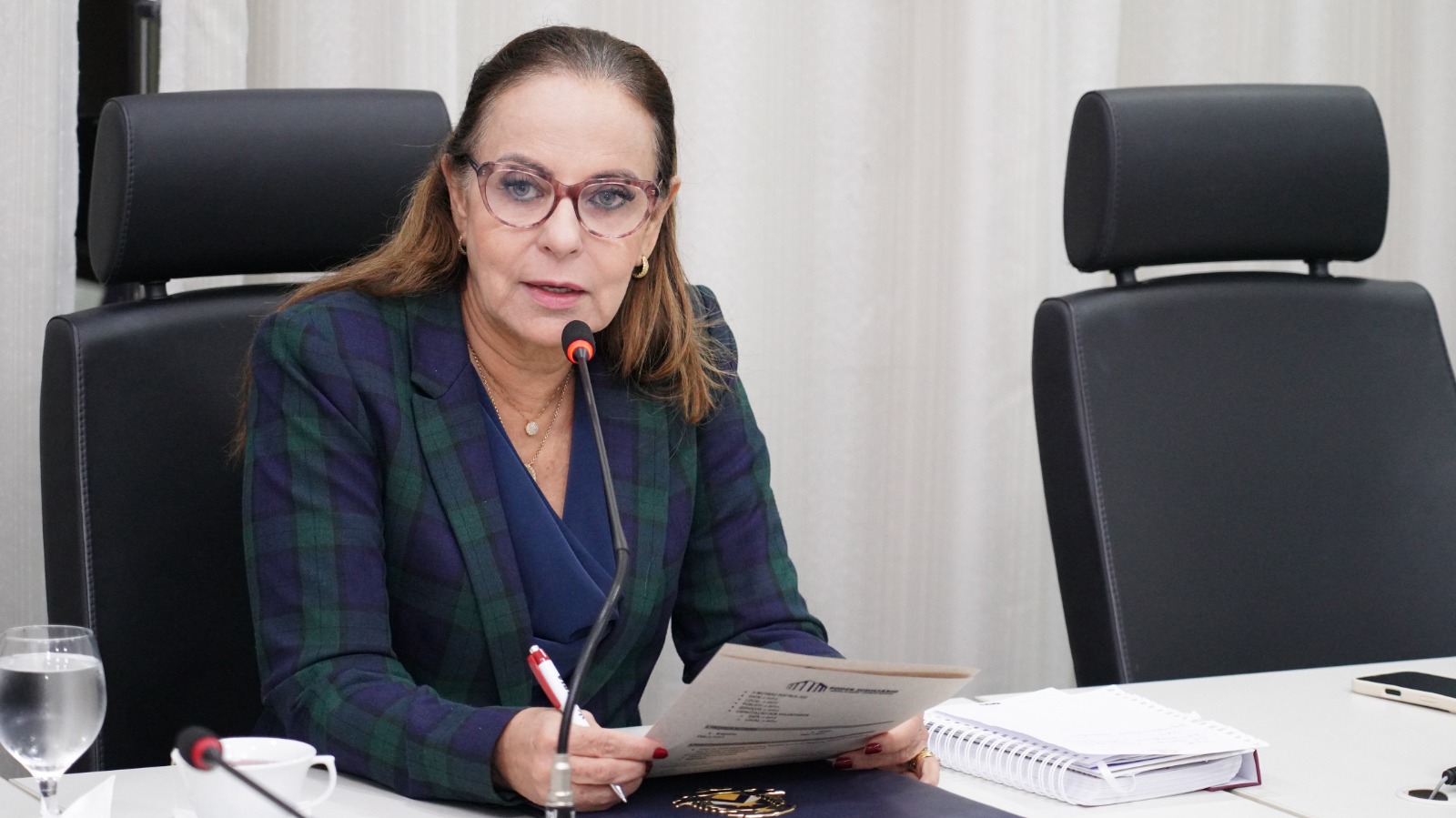 Elias Oliveira Sala de reunião com mesas dispostas em formato de “U”, onde cerca de 15 pessoas participam de um encontro. Ao centro, a desembargadora Ângela Prudente ocupa a posição principal da mesa. Os participantes estão sentados, alguns com notebooks abertos, celulares e blocos de anotação. Há microfones individuais sobre as mesas, copos de água e garrafas. O ambiente possui paredes claras, cortinas ao fundo e piso em granito.