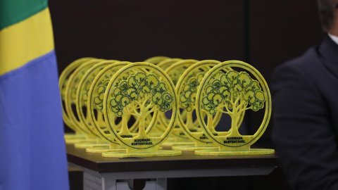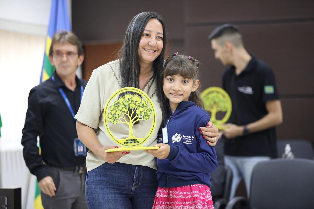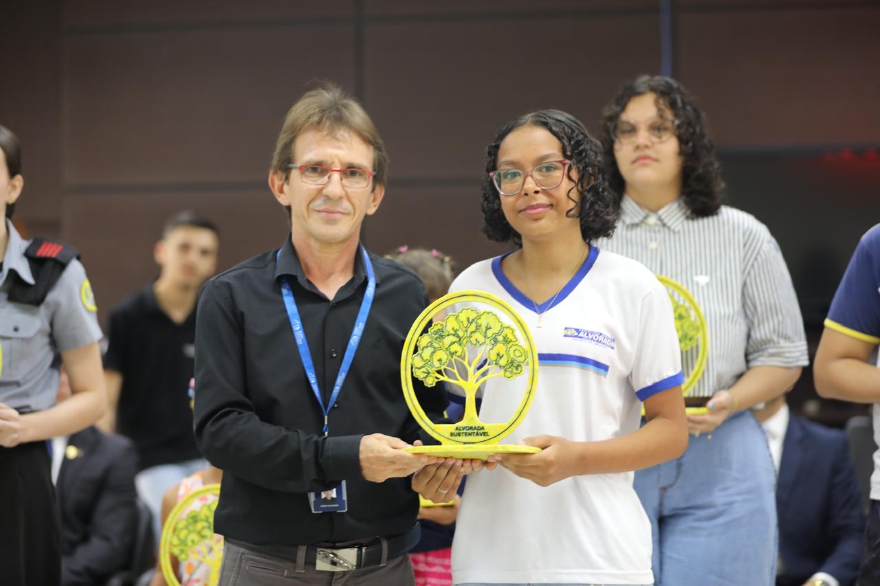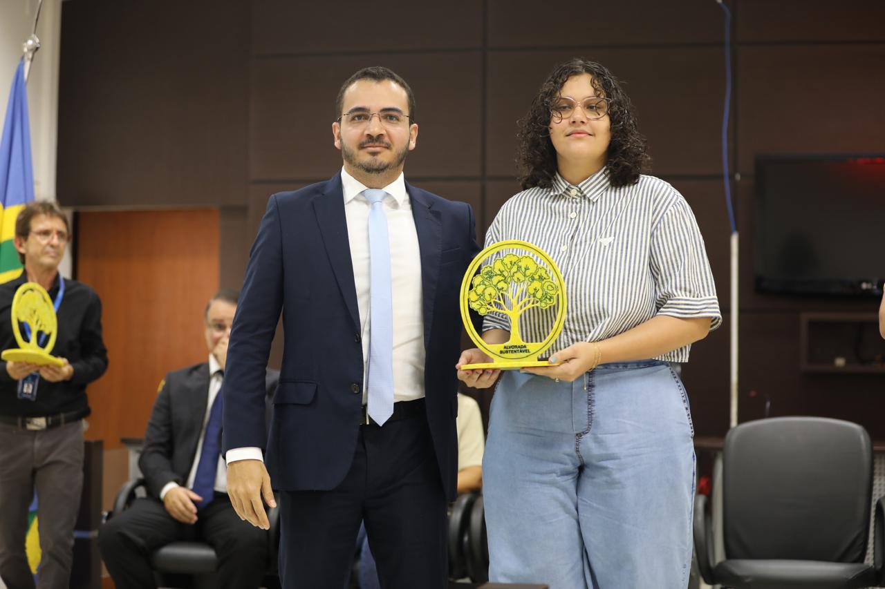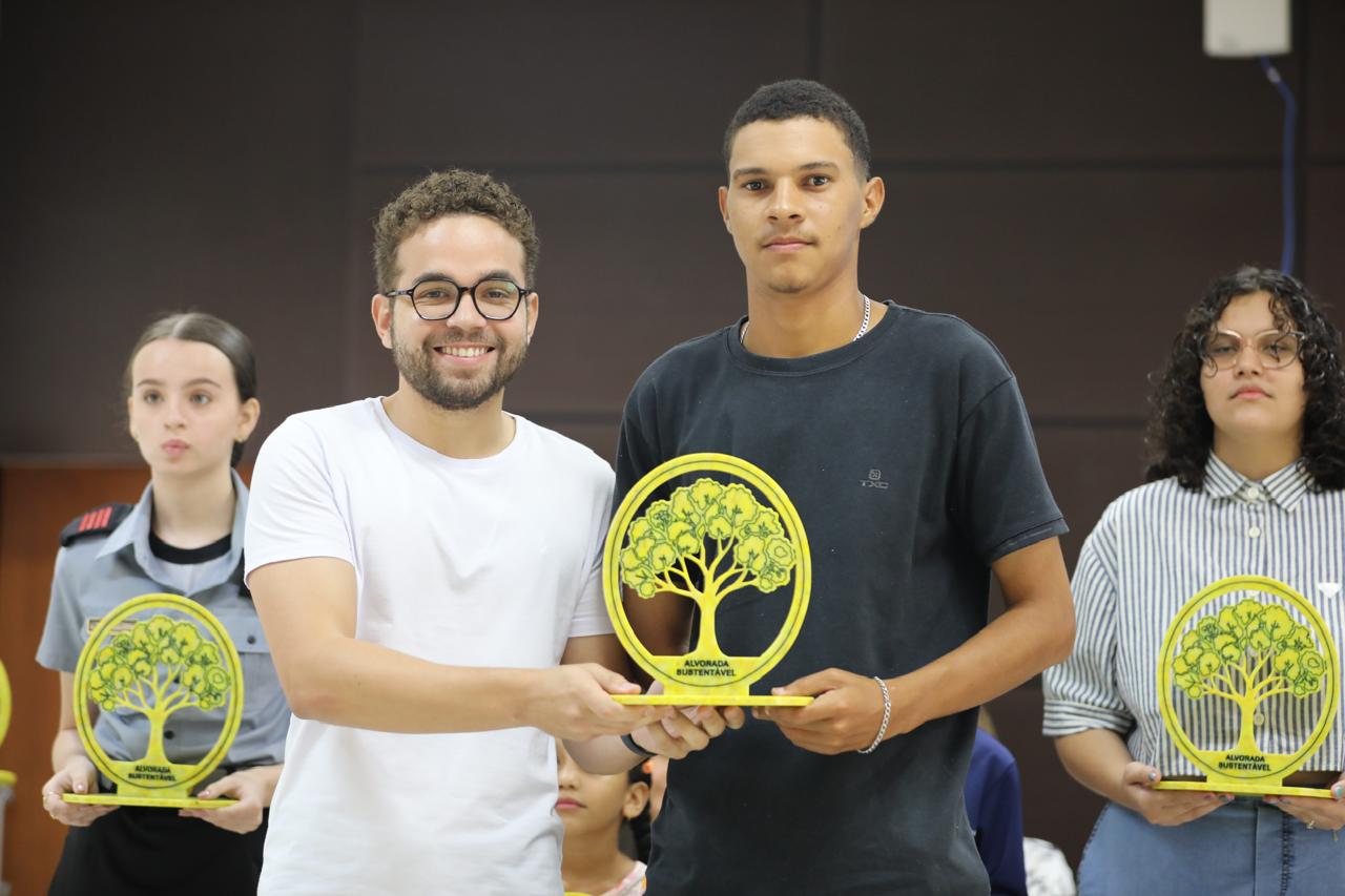 Eduarda Lima Duas pessoas posam segurando um troféu com o símbolo de uma árvore e a inscrição “Alvorada Sustentável”. Ao fundo, bandeiras oficiais reforçam o contexto de reconhecimento ligado à sustentabilidade e responsabilidade ambiental.