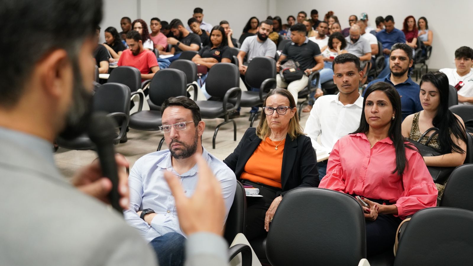 Rondinelli Ribeiro Alunos sentados reunidos em uma sala olhando atentamente ao slide apresentado pelo Juiz Welligton Magalhães