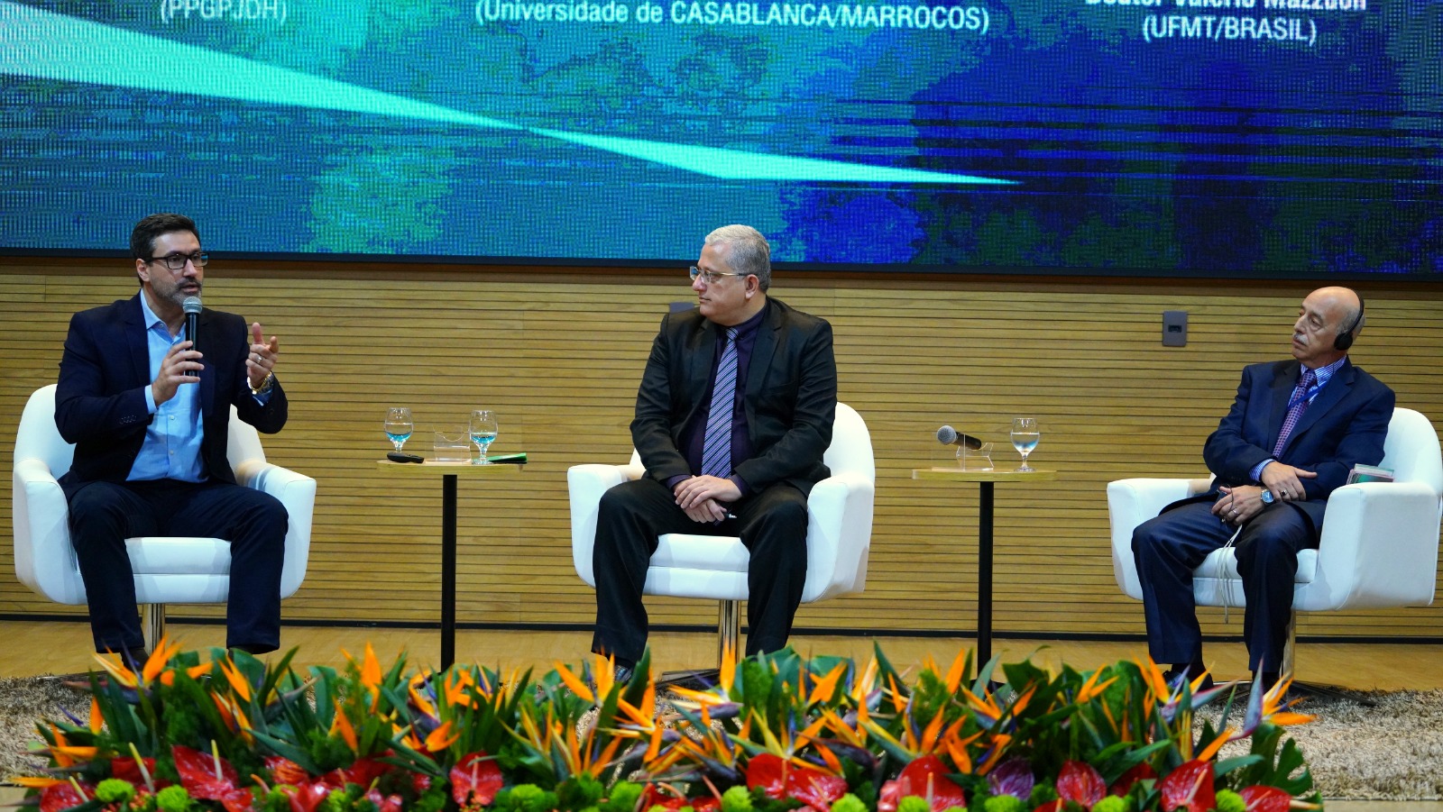 O painel sobre os desafios e os avanços dos sistemas de proteção dos direitos humanos na América e na África encerrou a programação do segundo dia do XVII Congresso Internacional em Direitos Humanos – o Estado de Coisas Inconstitucional, nesta quinta-feira (3/10). O tema foi abordado pelo doutor Mohamed Jaouhar, da Universidade de Casablanca/Marrocos, e pelo doutor Valério Mazzuoli, da Universidade Federal de Mato Grosso/Brasil, e teve como moderador o doutor Tarsis Barreto Oliveira (PPGPJDH).
