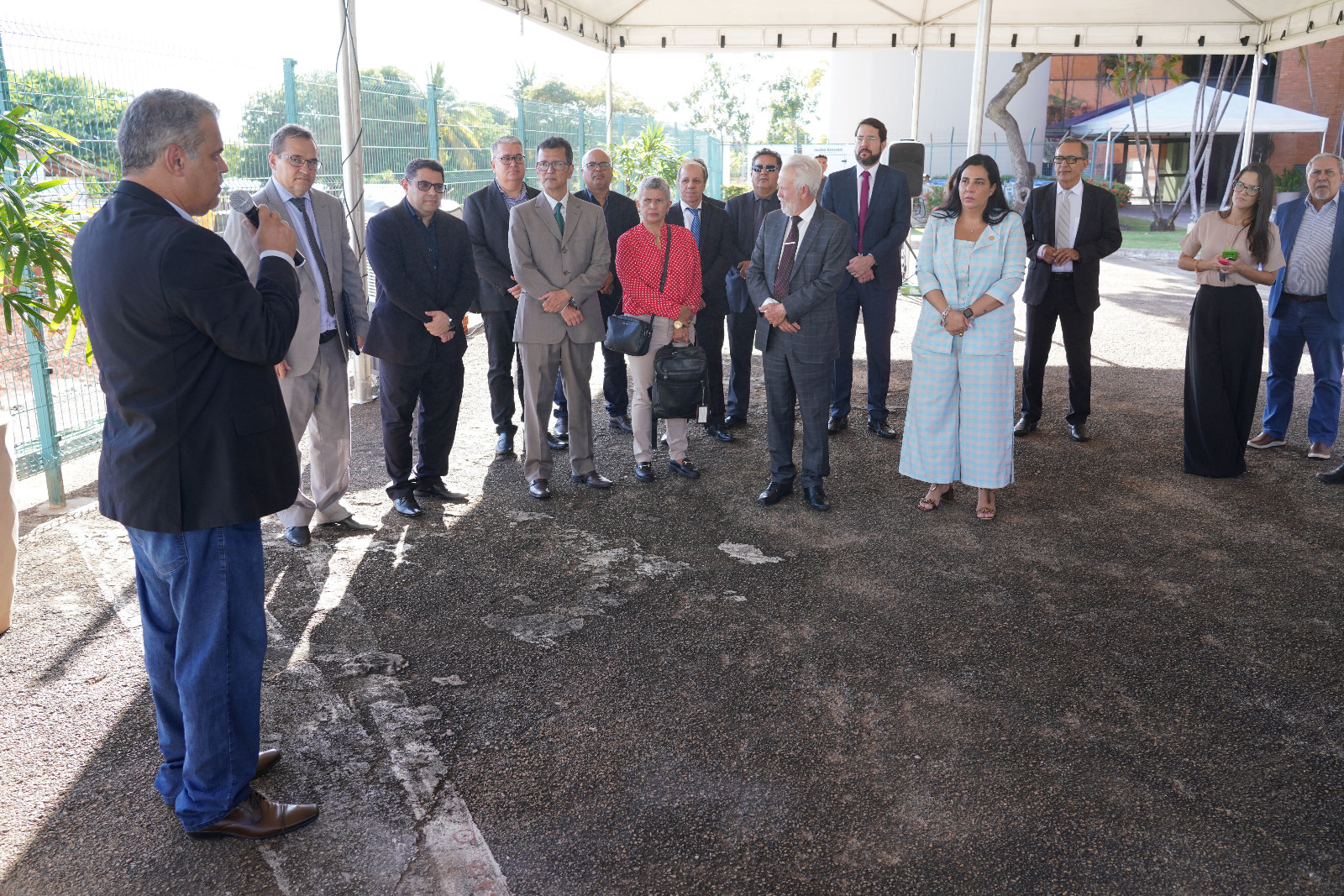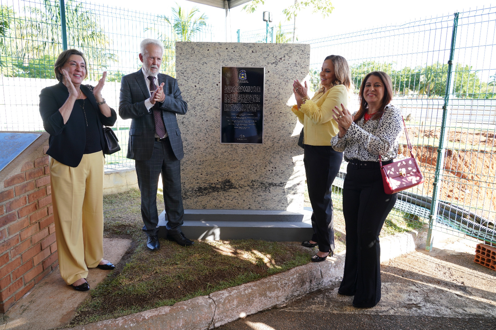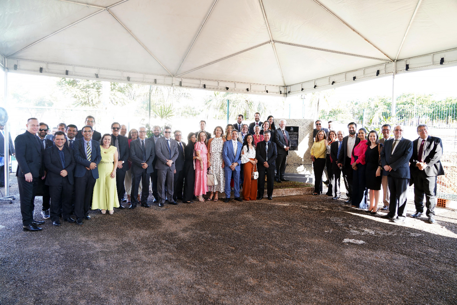 Rondinelli Ribeiro/Comunicação TJTO Ao lado da pedra fundamental, magistrados batem palmas durante lançamento de obra no estacionamento do TJTO