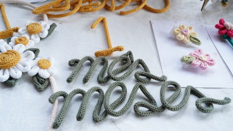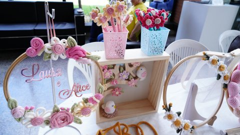Elias Oliveira Artesã sorri enquanto exibe um quadro artesanal com flores e passarinhos de crochê, durante uma feira de artesanato com mesas de produtos ao fundo