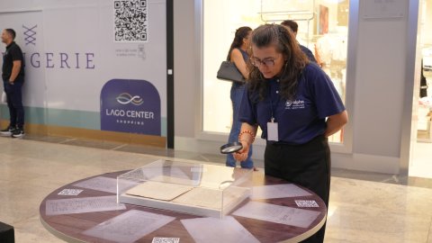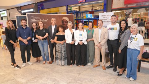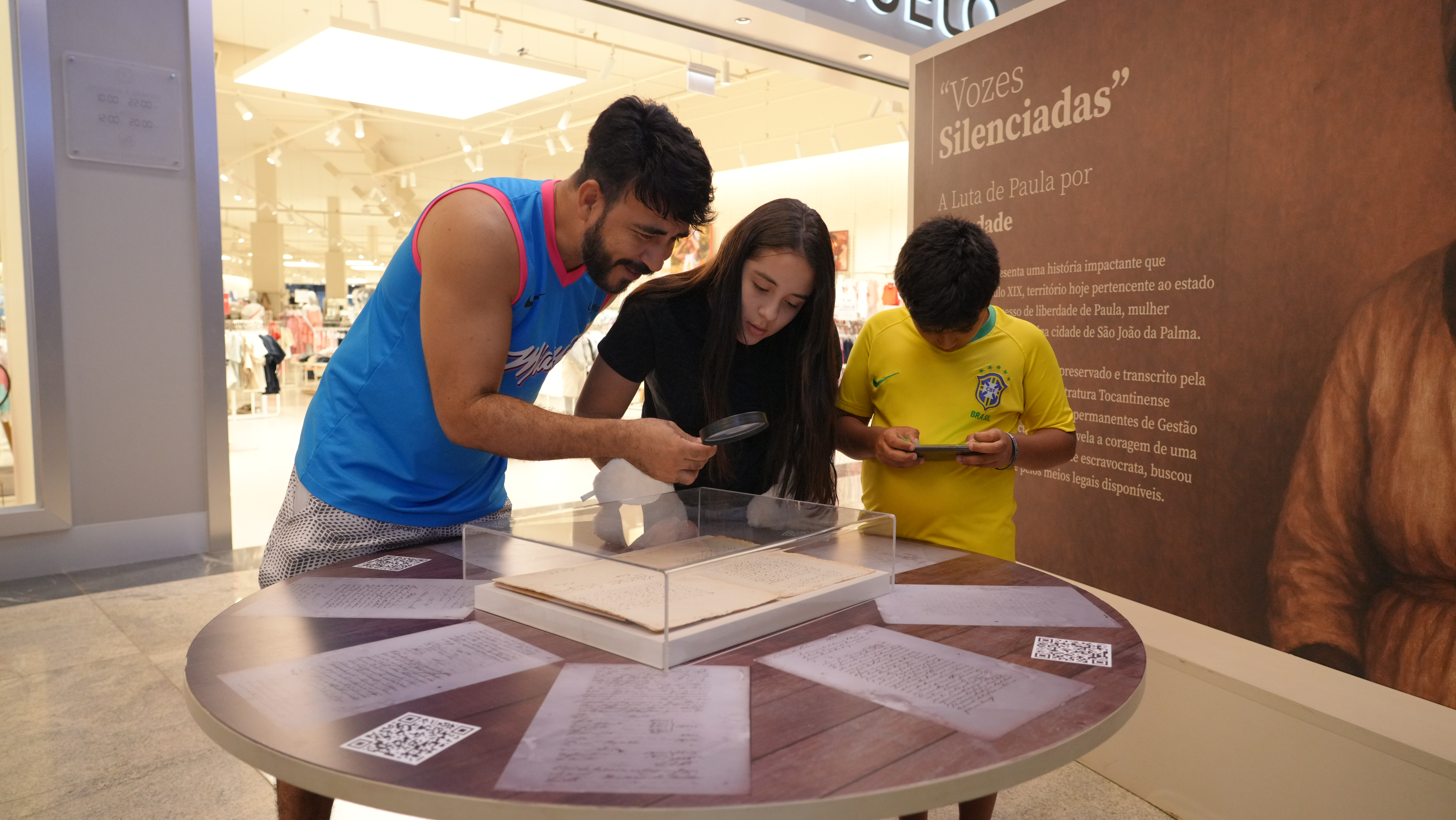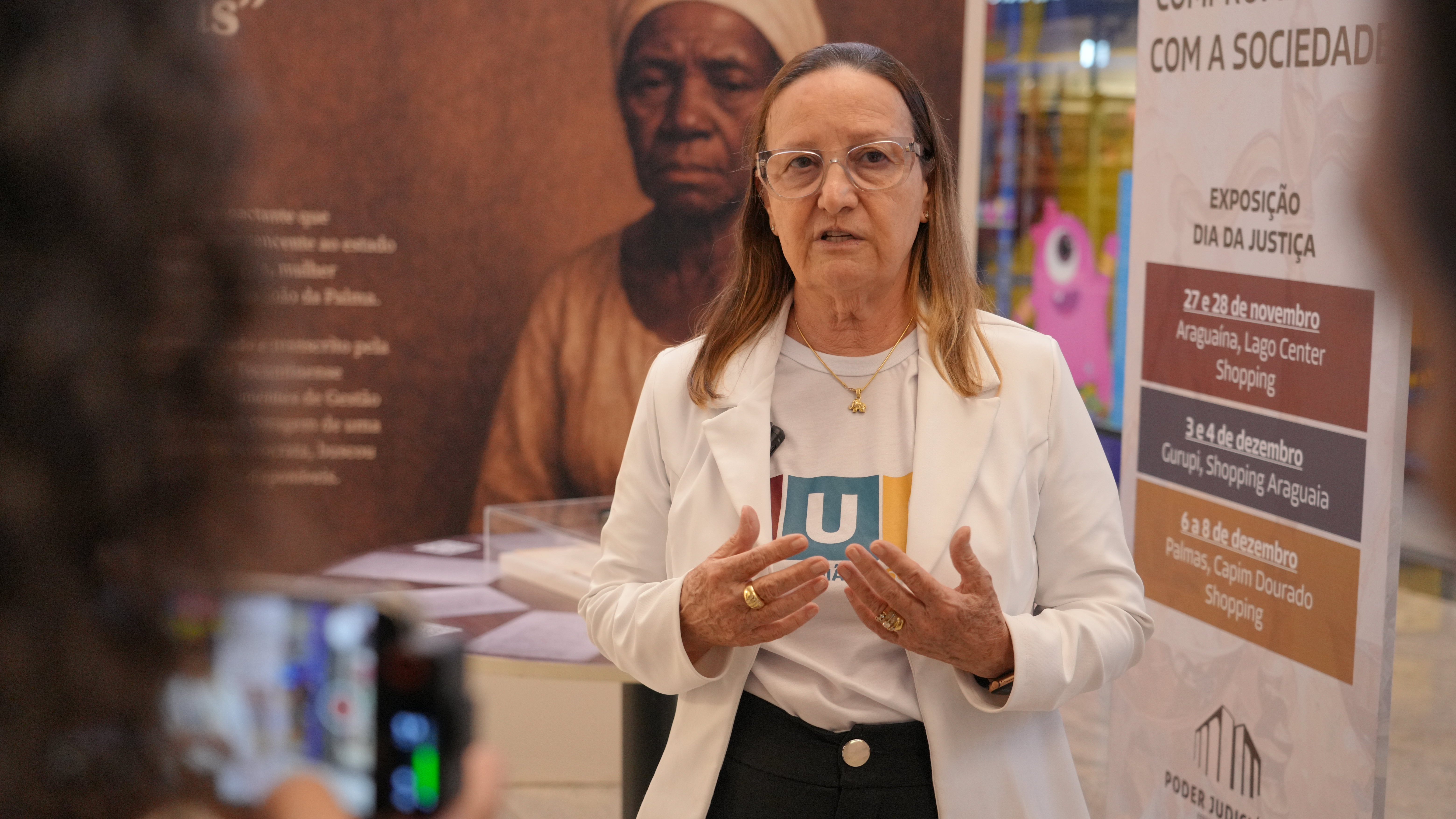 Lucas Nascimento A presidente do TJTO, desembargadora Maysa Vendramini,  observa documentos expostos sobre uma mesa; ela está ao centro e usa uma lupa, observada por uma mulher (esq) e um homem (dir). À direita, há um painel com a imagem de uma mulher negra. O cenário é um shopping, com vitrines ao fundo.