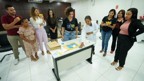 Rondinelli Ribeiro Mulher de camiseta preta atrás de mesa branca entrega cartão amarelo para mulher de camiseta branca e calça bege. Ao redor, homens e mulheres em pé, aplaudem