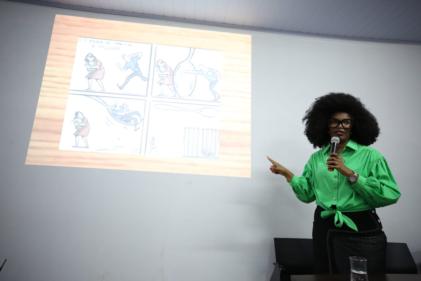 A juíza abriu a palestra com a história da farmacêutica bioquímica Maria da Penha, que viveu o drama da violência doméstica até chegar à tentativa de homicídio pelo seu então marido, que a levou para a cadeira de rodas. A Lei Maria da Penha - Lei n⁰ 11.340/2006 foi um marco na legislação brasileira no enfrentamento à violência doméstica no país.