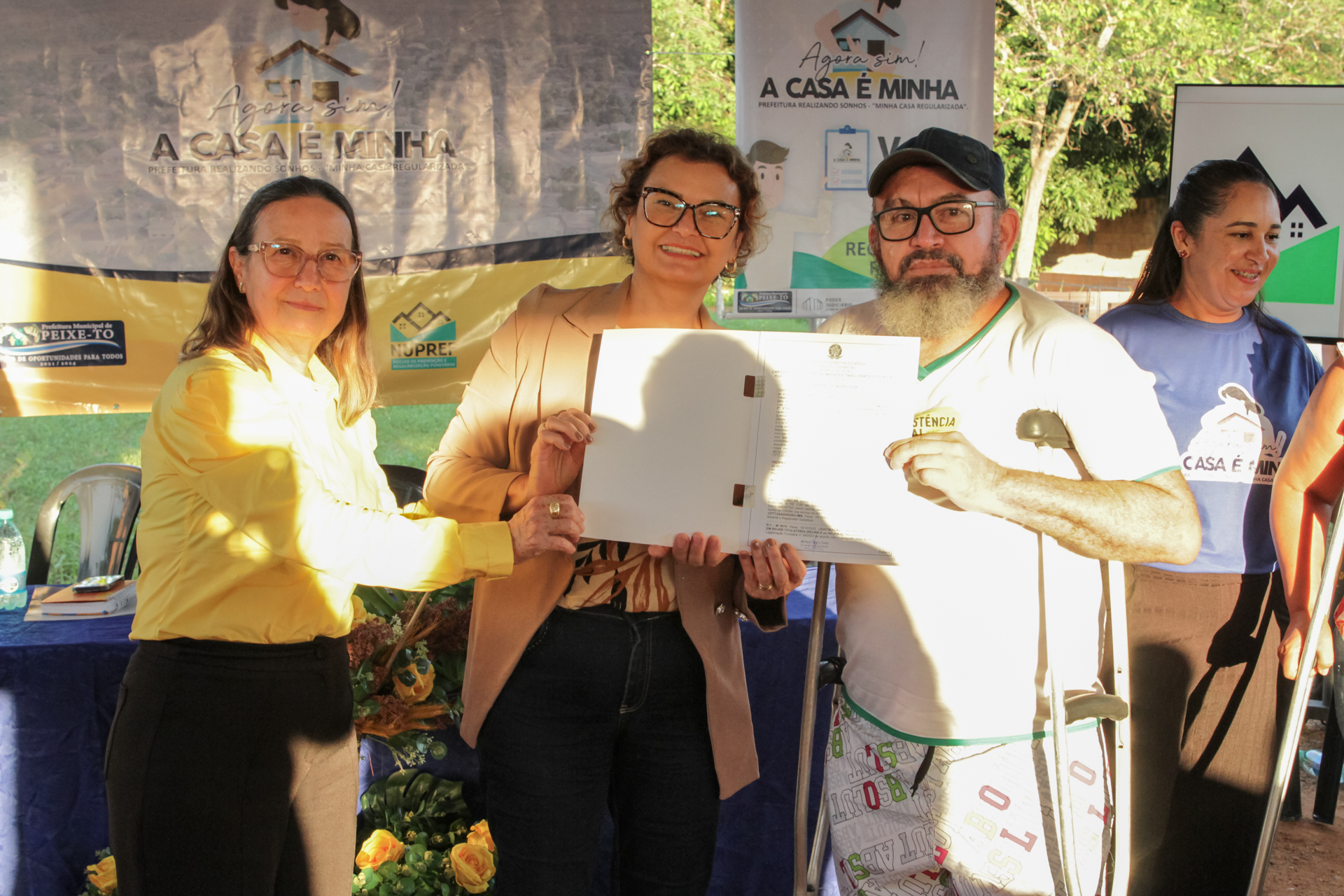 “Agora sim! A casa é minha”. O nome que dá vida ao Programa de Regularização Fundiária Urbana (Reurb) do município de Peixe pode ser efetivamente sentido pelos 45 cidadãos contemplados com o título de suas propriedades na tarde desta segunda-feira (27/11). Esta foi a 1ª etapa de entrega de títulos de regularização fundiária no município e beneficiou moradores do setor Aeroporto 2ª Etapa.