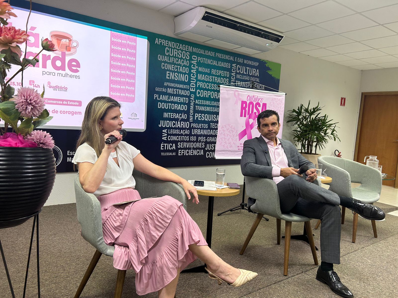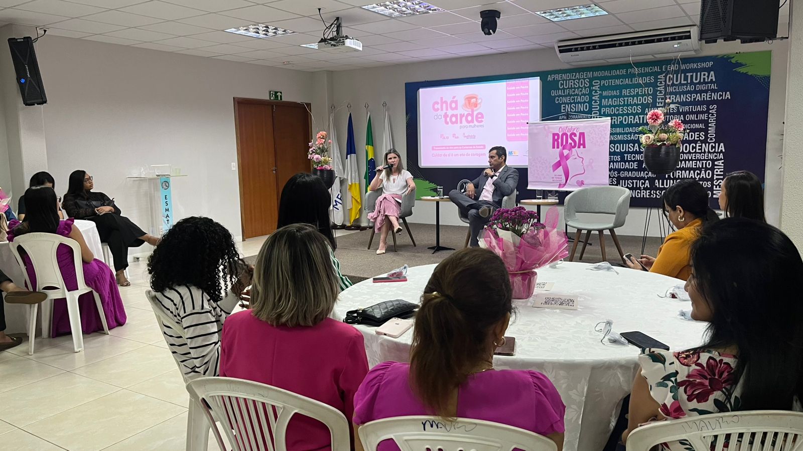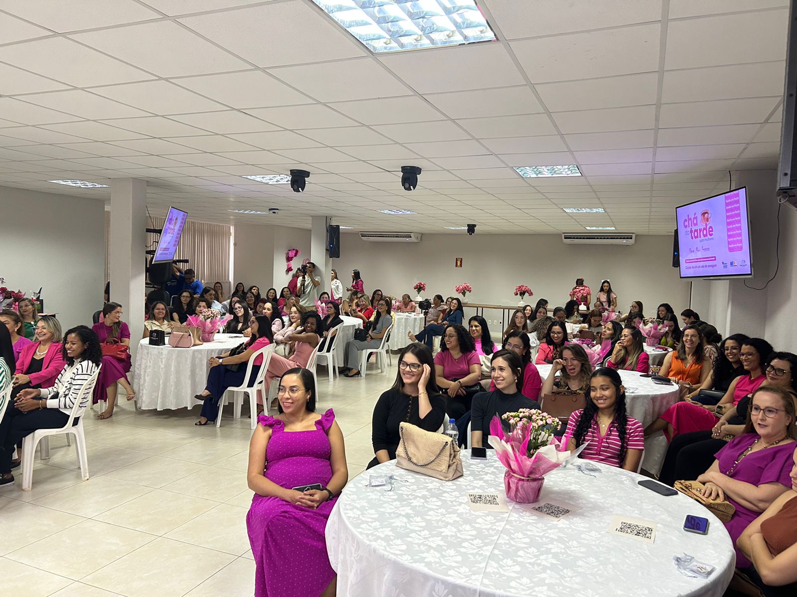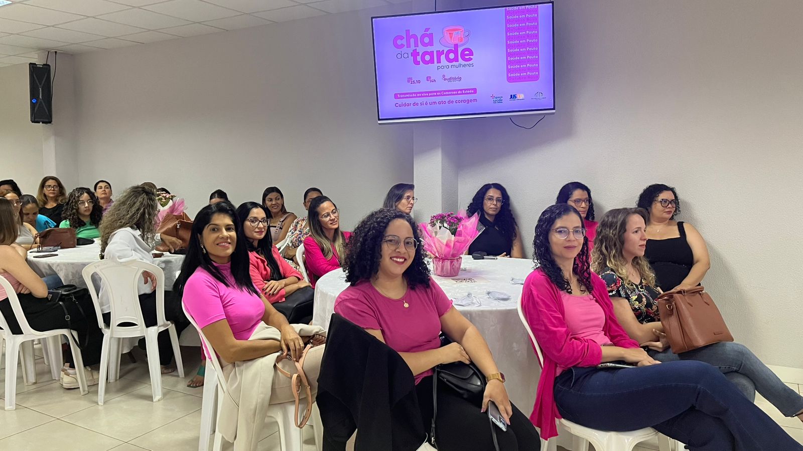 Guilherme Rodrigues Fotografia colorida que mostra uma sala repleta de mulheres usando rosa assistindo a uma palestra. Nos televisores se vê o nome Chá da Tarde e o simbolo do Outubro Rosa