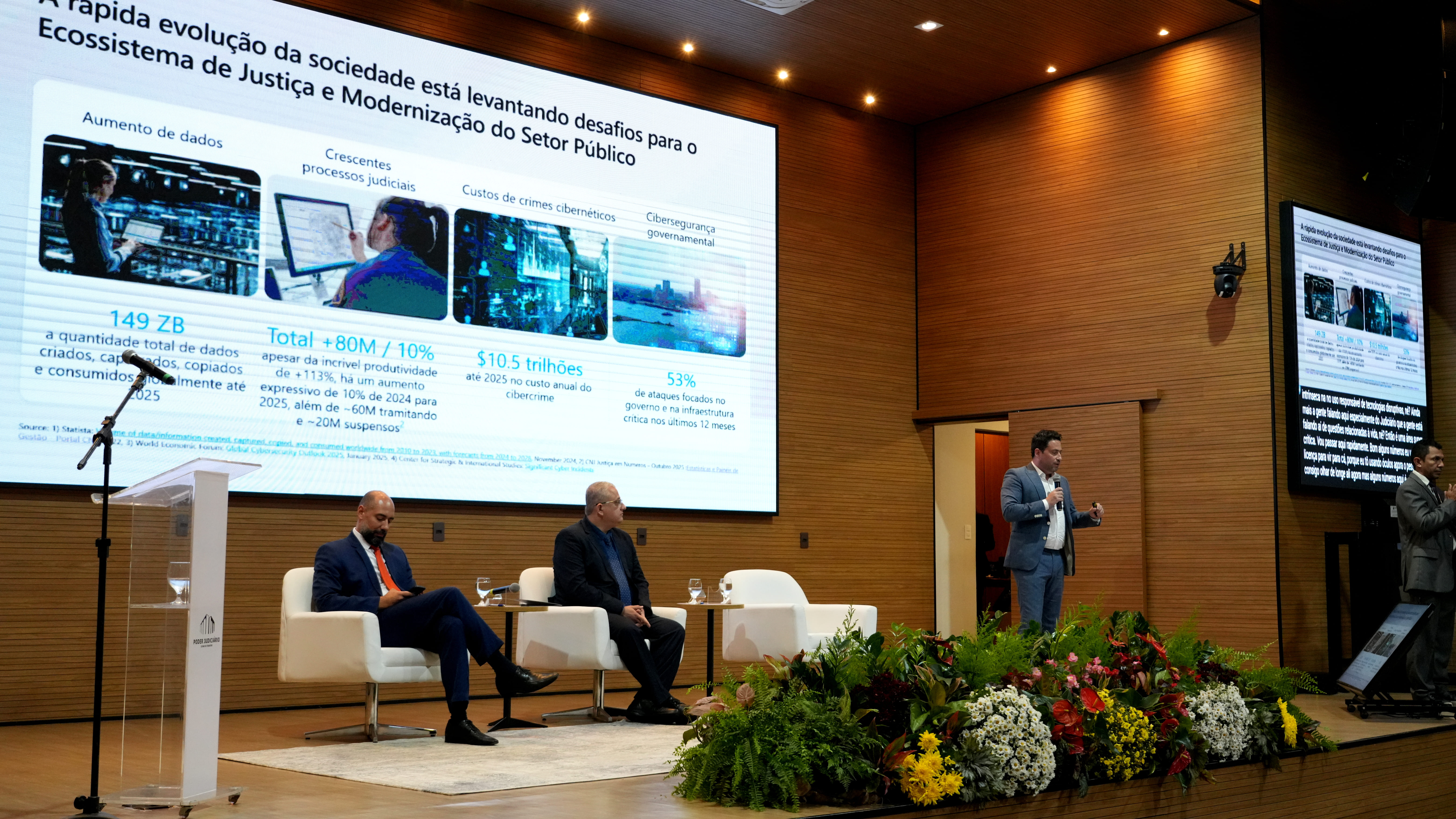 Carlos Augusto, da Microsoft, trouxe uma visão global e estratégica sobre o uso da IA na modernização do setor público, destacando os impactos da tecnologia no ecossistema de Justiça.