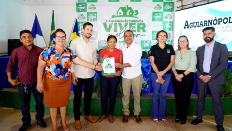 Nesta primeira etapa da entrega de títulos de Regularização Fundiária de Aguiarnópolis 65 moradores receberam os documentos definitivos. “Essa é a realização de um sonho, de pessoas que sempre batalharam para ter uma casa própria. Essa ação vai transformar a vida de todos que moram lá”, disse a moradora Dagna Martins.