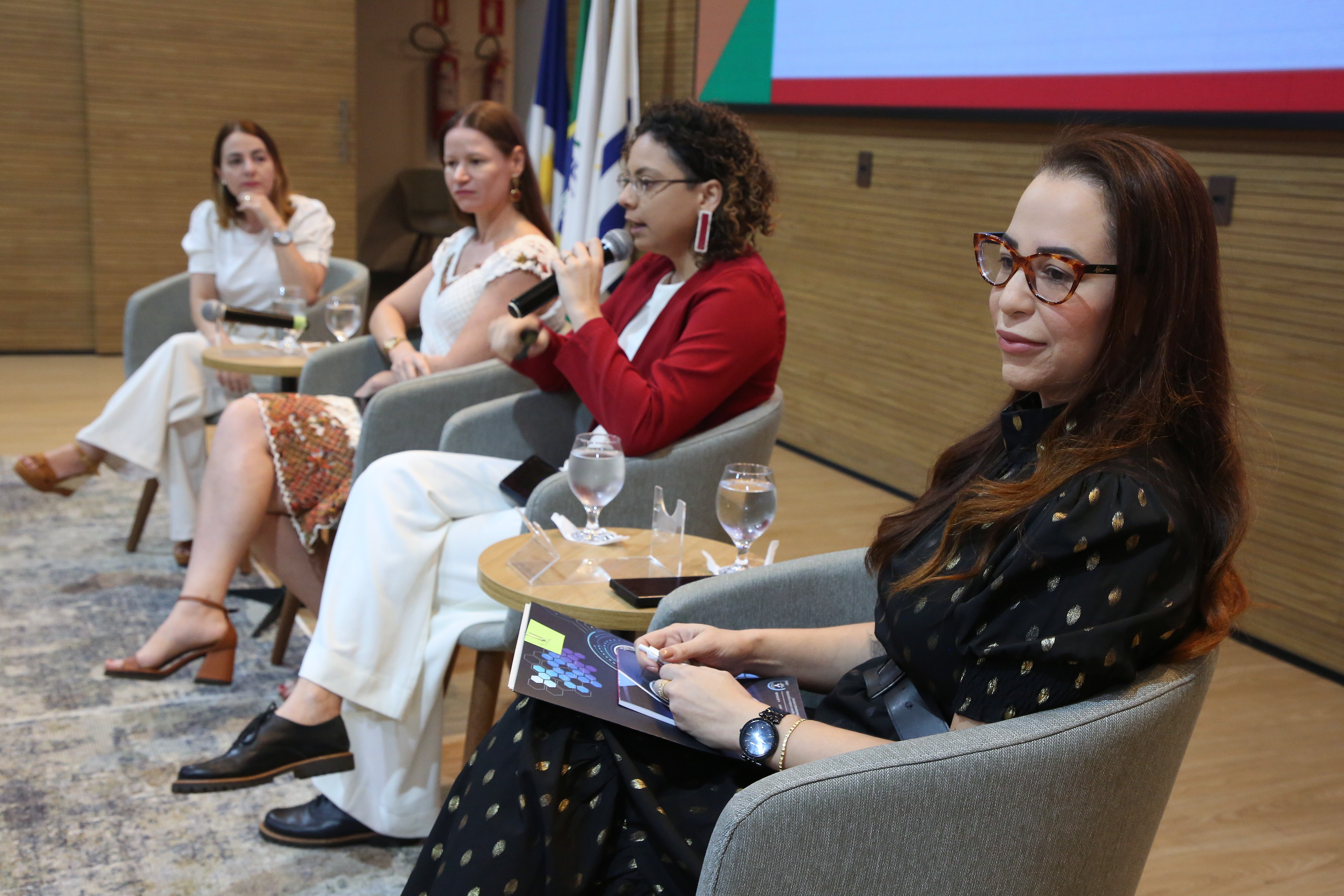 Na imagem, quatro expositoras participam de uma mesa temática durante o evento. Sentadas lado a lado em poltronas cinza, elas dialogam em um ambiente moderno e acolhedor. À esquerda, duas participantes vestem roupas claras, enquanto a terceira, de blazer vermelho e calça branca, fala ao microfone. A quarta expositora, à direita, veste um vestido preto com detalhes dourados e segura um tablet. Ao fundo, o telão exibe os logotipos.