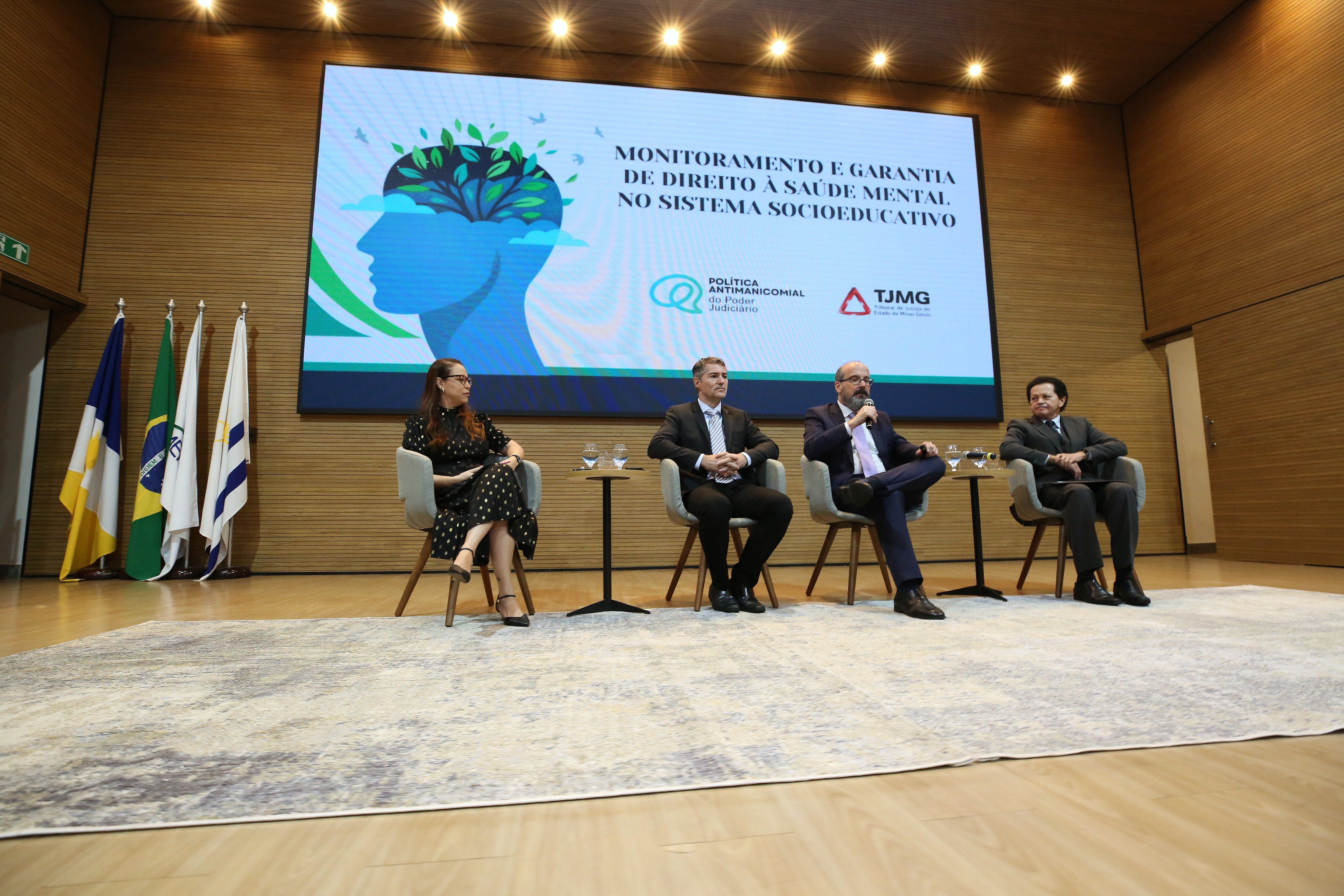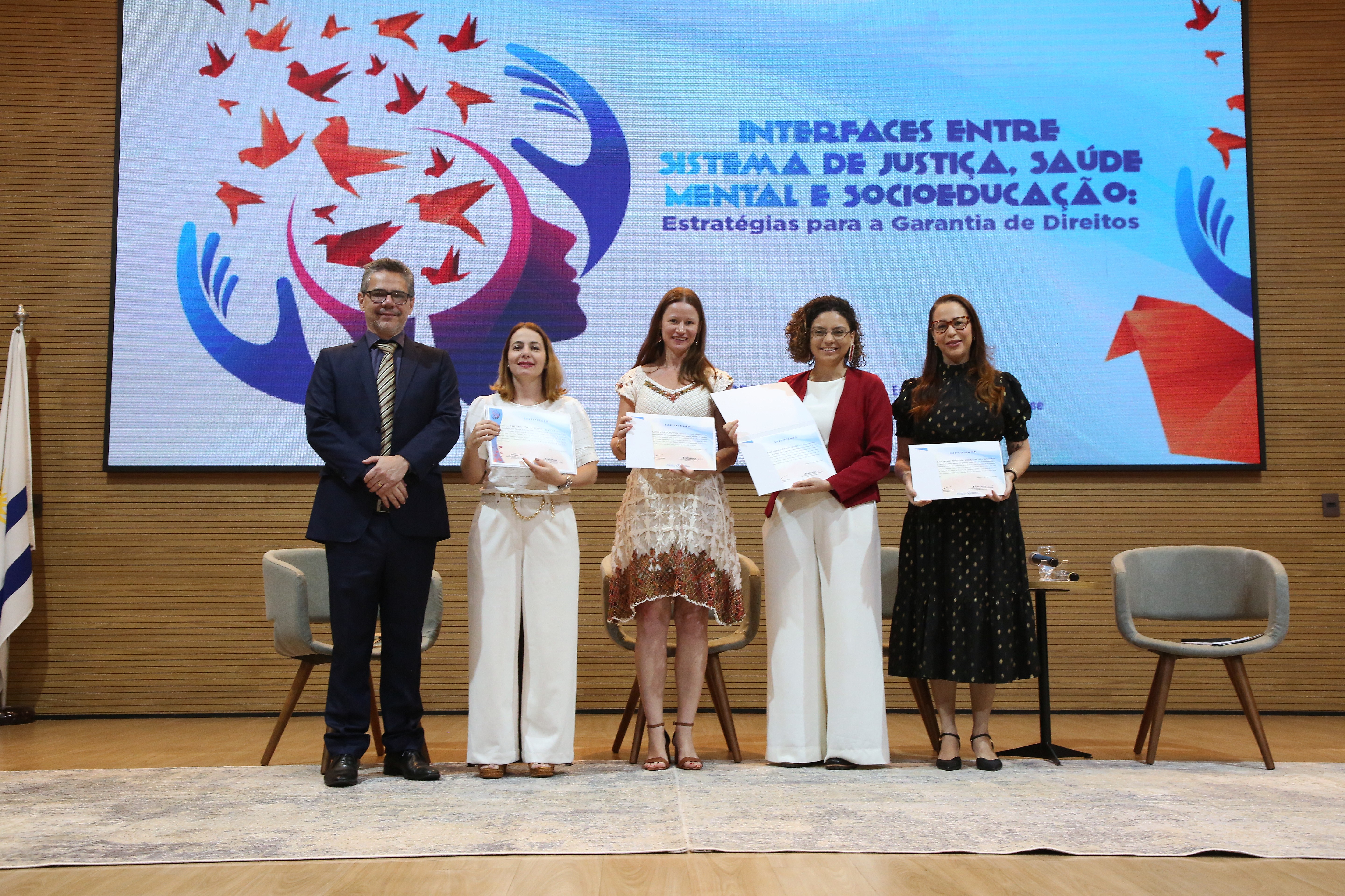 Fotos: Hodirley Canguçu/Esmat Na foto, quatro expositoras participam de uma mesa temática sobre “Saúde Mental e o PIA”, realizada em um auditório moderno. Sentadas em poltronas cinza no palco, elas dialogam diante de uma plateia atenta. Ao fundo, um grande telão exibe o slide com o título da apresentação e o logotipo do Ministério dos Direitos Humanos e da Cidadania (MDHC), com trechos da Lei nº 12.594/2012 (Lei do Sinase).