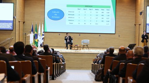 A palestra "Análise de Risco de Pessoa: a Convergência das Medidas de Proteção com os Procedimentos de Segurança Adequados" foi proferida por Alessandre Roberto dos Reis, chefe da Divisão de Análise Estratégica da Diretoria de Inteligência da Polícia Federal. Durante sua apresentação, ele destacou as responsabilidades da equipe na análise de risco e segurança pessoal, destacando as principais estruturas de gestão de riscos reconhecidas mundialmente e discutindo a possibilidade de implementação de uma metodologia padronizada na Polícia Federal.