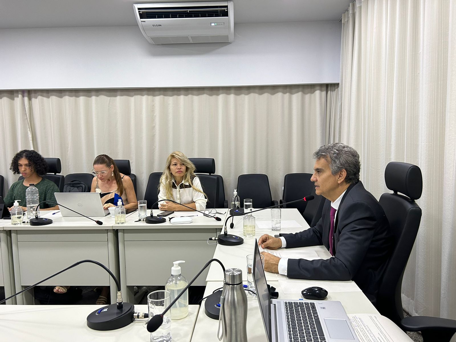 Divulgação Homens e mulheres sentados em torno de mesa branca em formato U, com microfones individuais, durante reunião sobre pessoas com transtorno mental em conflito com a lei, numa sala de paredes brancas com cortina branca