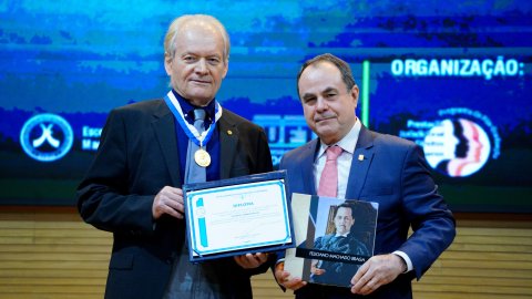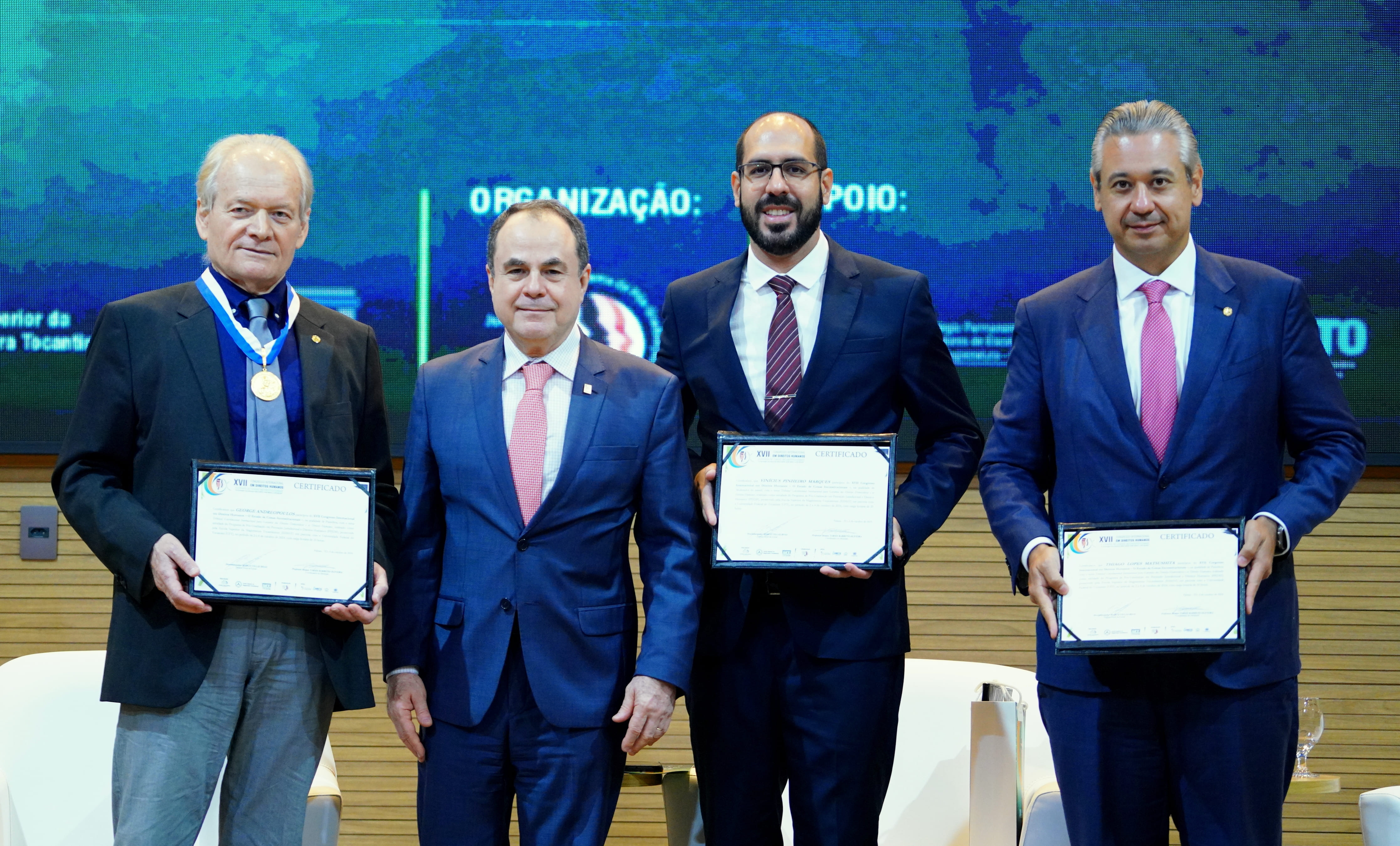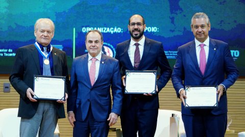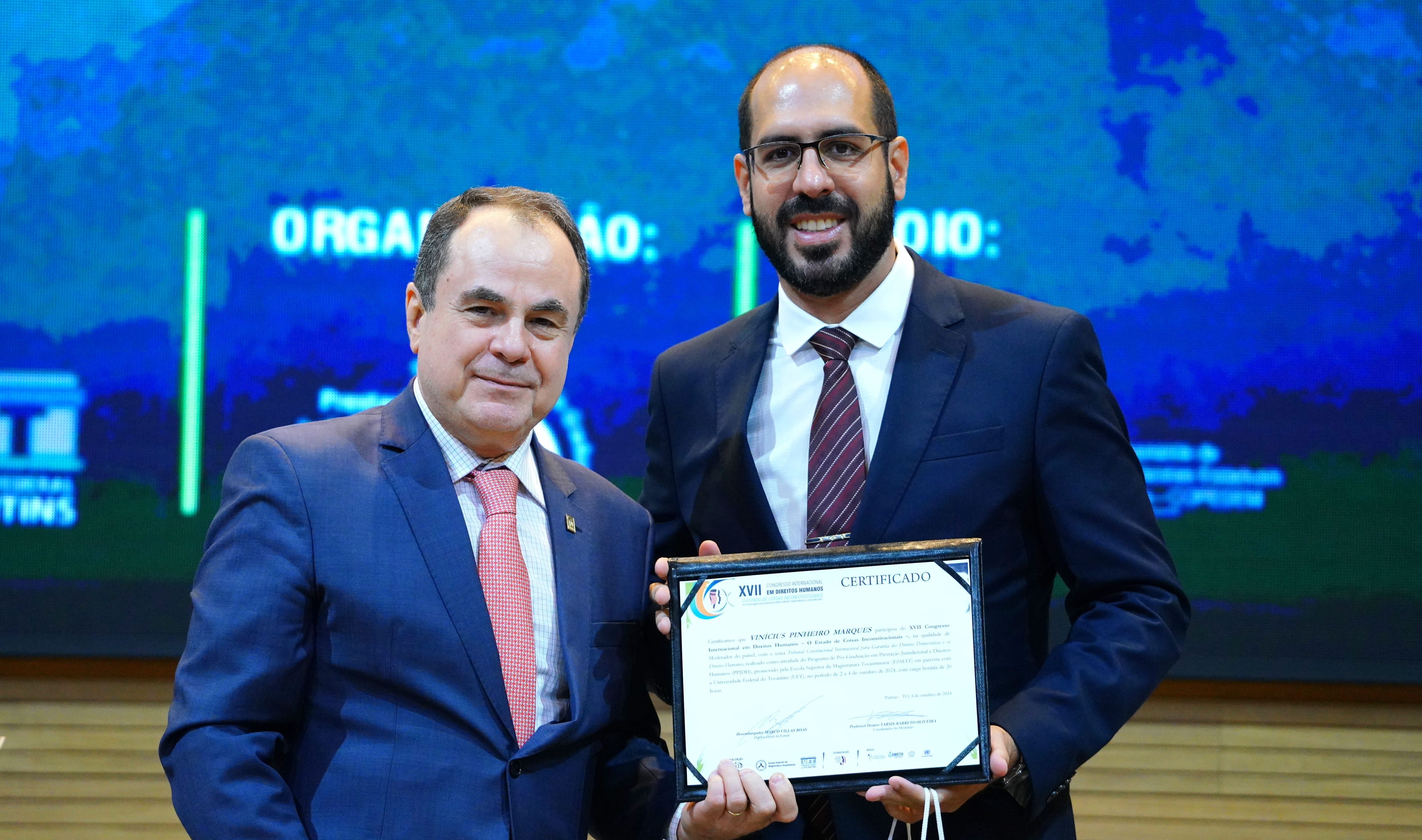 Ao final das apresentações, os palestrantes foram homenageados em reconhecimento às suas contribuições para o aprimoramento do sistema de justiça. A homenagem foi entregue pelo desembargador Marco Villas Boas.