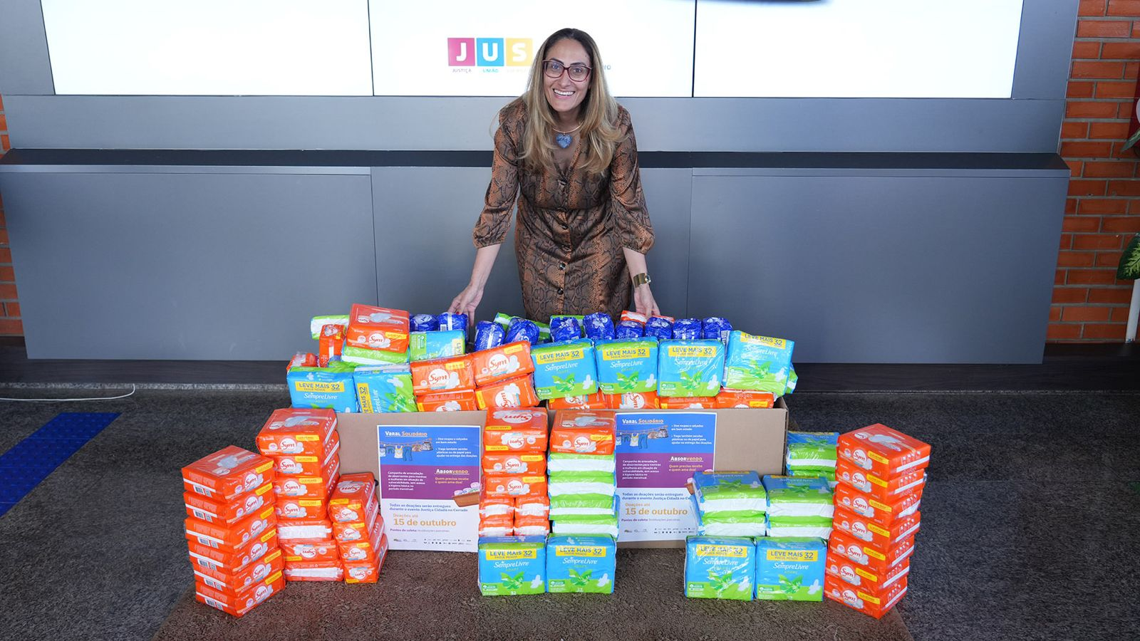 Juíza Rosa Maria e absorventes arrecadados para esta edição do mutirão, em Mateiros