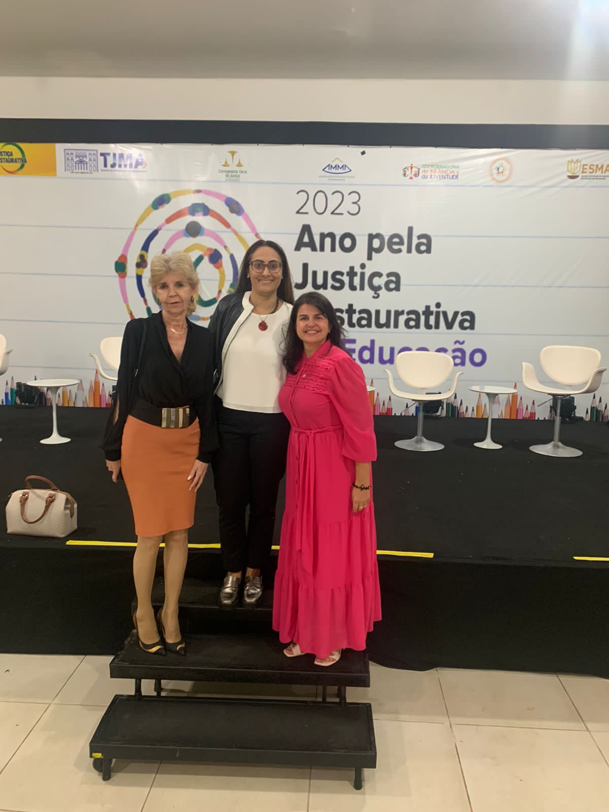 Divulgação magistradas tocantinenses posam para foto sentadas em uma cadeira a frente de um banner com escrita "2023 Ano pela Justiça Restaurativa"