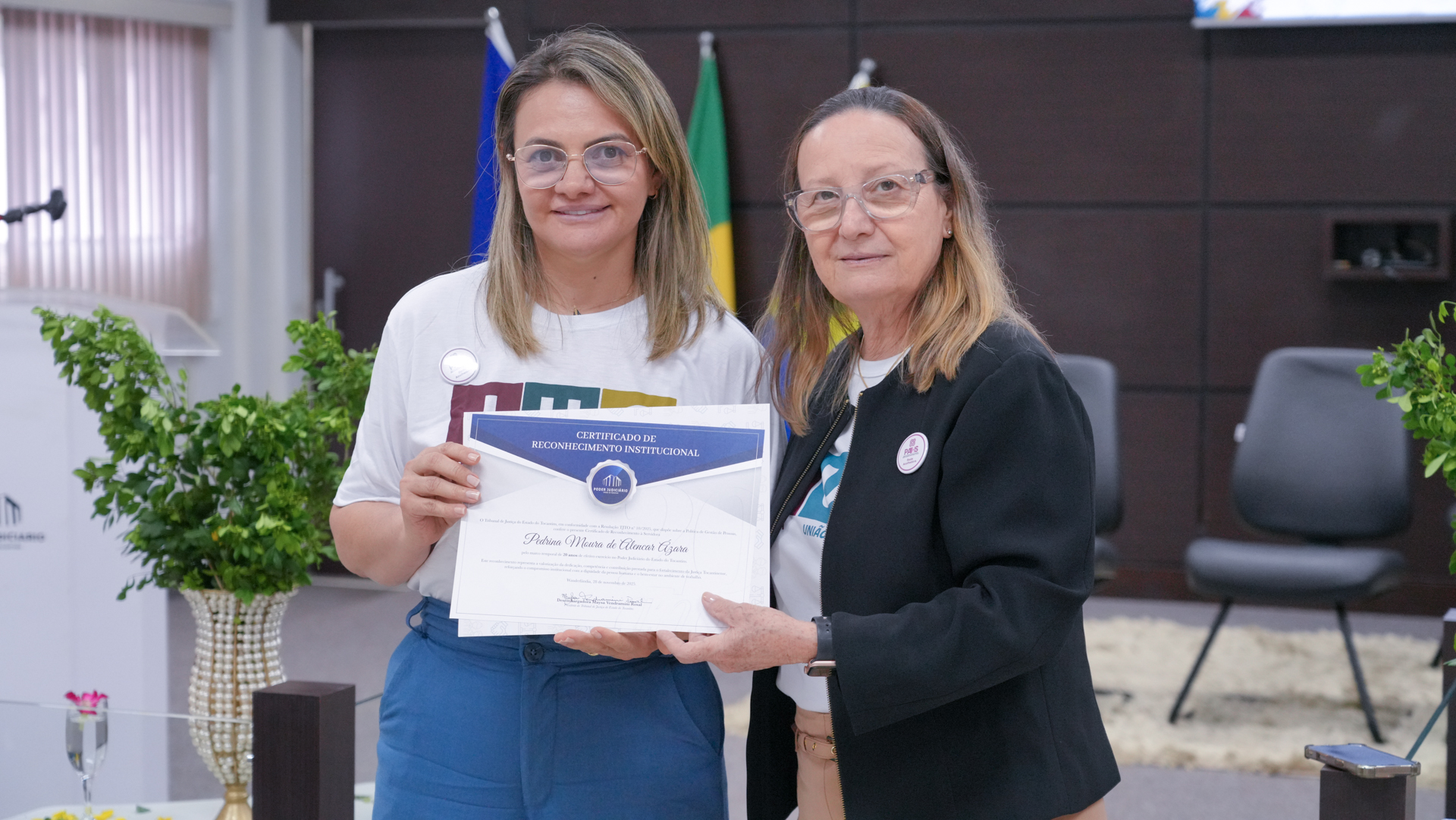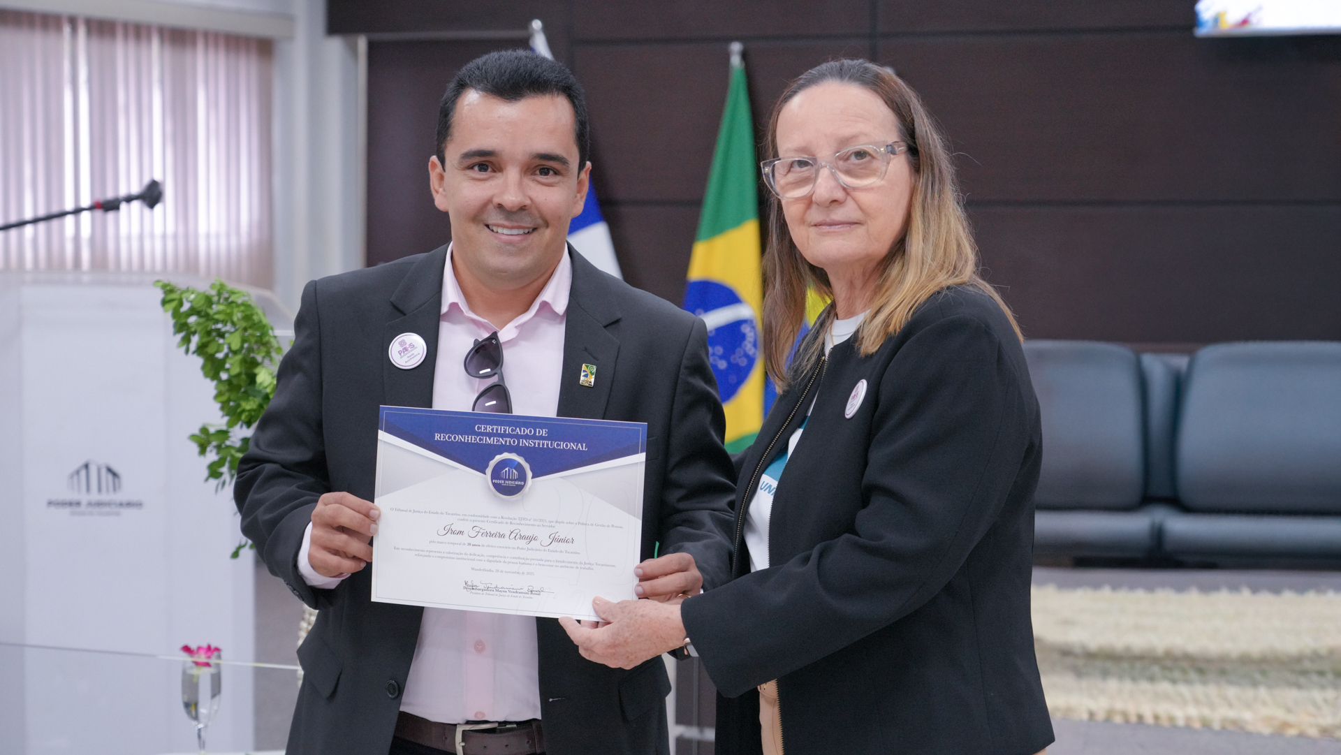 Em Wanderlândia, a diretora de Gestão de Pessoas, Paula Maia, anunciou os nomes conforme a Portaria nº 2909/2025, sendo todos eles agraciados pelo marco de 20 anos: as técnicas judiciárias Andréa de Vasconcelos Diogo da Silva e Pedrina Moura de Alencar Ázara, e o oficial de justiça Irom Ferreira Araújo Júnior.