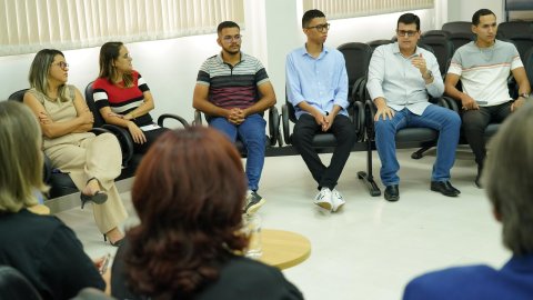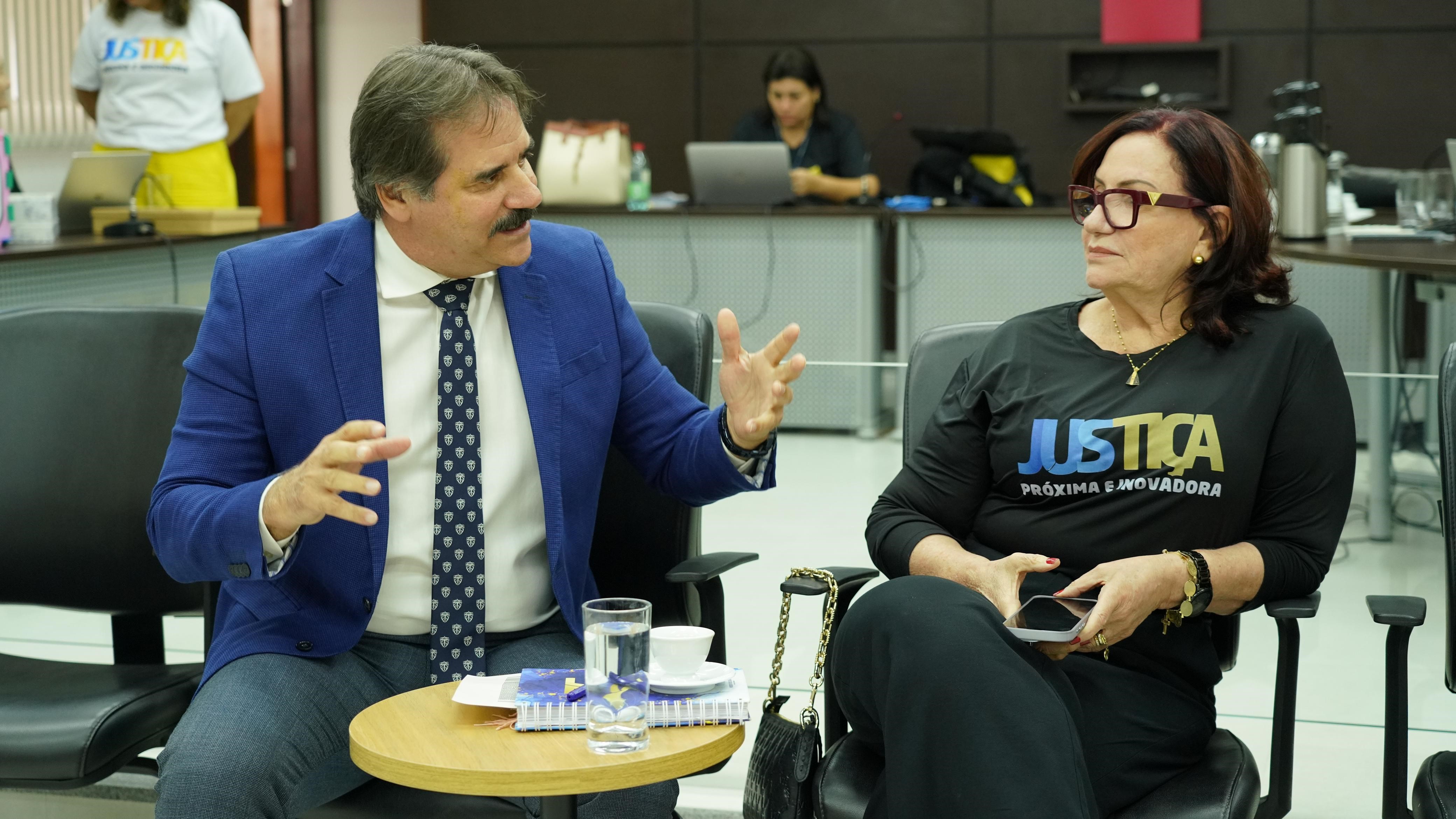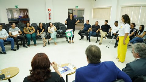 Rondinelli Ribeiro/Cecom/TJTO Grupo de pessoas em um ambiente bem iluminado, sentados em semi-círculo. No centro, a presidente do Tribunal de Justiça do Tocantins, Etelvina Maria Sampaio Felipe.