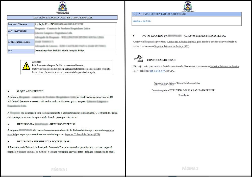 Dez decisões estão publicadas em linguagem simples e com diagramação com recursos visuais para facilitar a compreensão. Conforme o projeto, neste piloto, a linguagem simples está sendo implantada em processos de “Agravo em Recurso Especial”. Os documentos já publicados tratam de processos sobre validação de diploma de graduação obtido no exterior por universidade tocantinense e de uma ação de cobrança entre empresas.