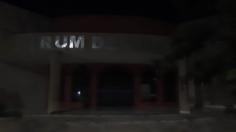 Fachada do prédio da Esmat às escuras, com vegetação ao redor e uma rua na frente.