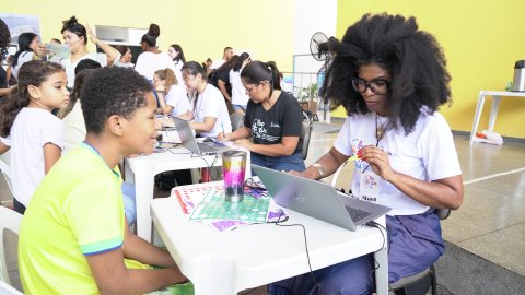 Elias Oliveira Na imagem aparece uma mulher de camiseta branca atende homem de boné azul em mesa com notebook e papéis. Ao fundo, outros voluntários prestam atendimentos no Pop Rua Jud.
