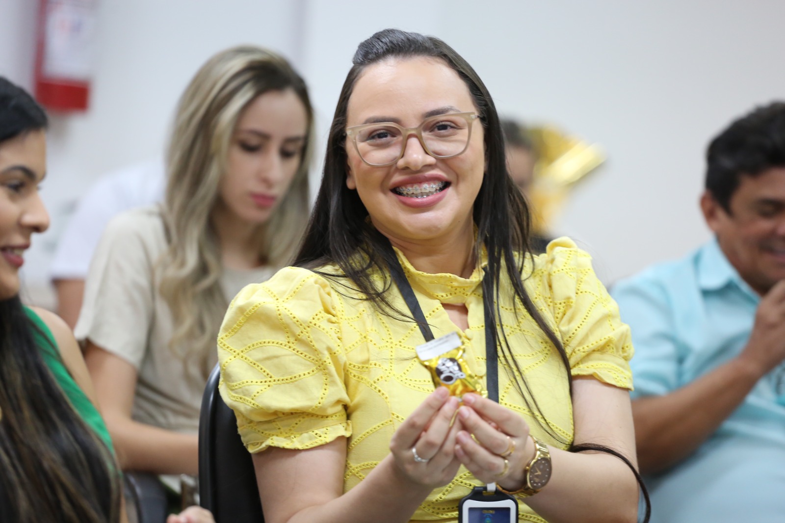 Elias Oliveira foto colorida horizontal mostra homens e mulhres de pé sorrindo no salão do juri do forum de goiatins
