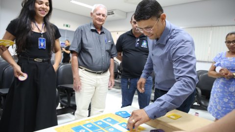 A tarde seguiu com as dinâmicas que, em cada visita, vem ganhando mais a adesão dos participantes. Uma delas é o Jogo do Dado, que basicamente trata-se de um sorteio de temas que fomentam perguntas e respostas entre servidores de 1º grau e diretores(as) setoriais do TJTO, como por exemplo o processo da URV e a atualização das normativas referentes às férias.