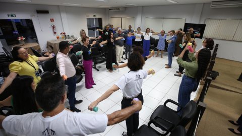 Segundo a diretora Márcia Mesquita, a partir de agora profissionais da saúde residentes nas Comarcas poderão prestar serviços in loco, com a abertura de editais de credenciamento pelo Grupo Gestor de Equipes Multidisciplinares (Ggem). Foi o caso da fisioterapeuta Larissa Silveira que, na parte final do encontro em Goiatins, ministrou uma sessão de alongamento e ginástica laboral acompanhada pela fisioterapeuta do Cesau, Hozana Lemos.