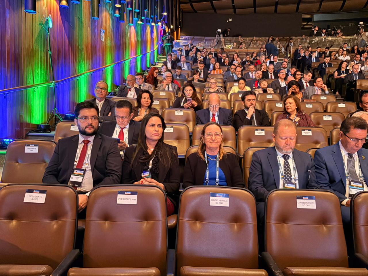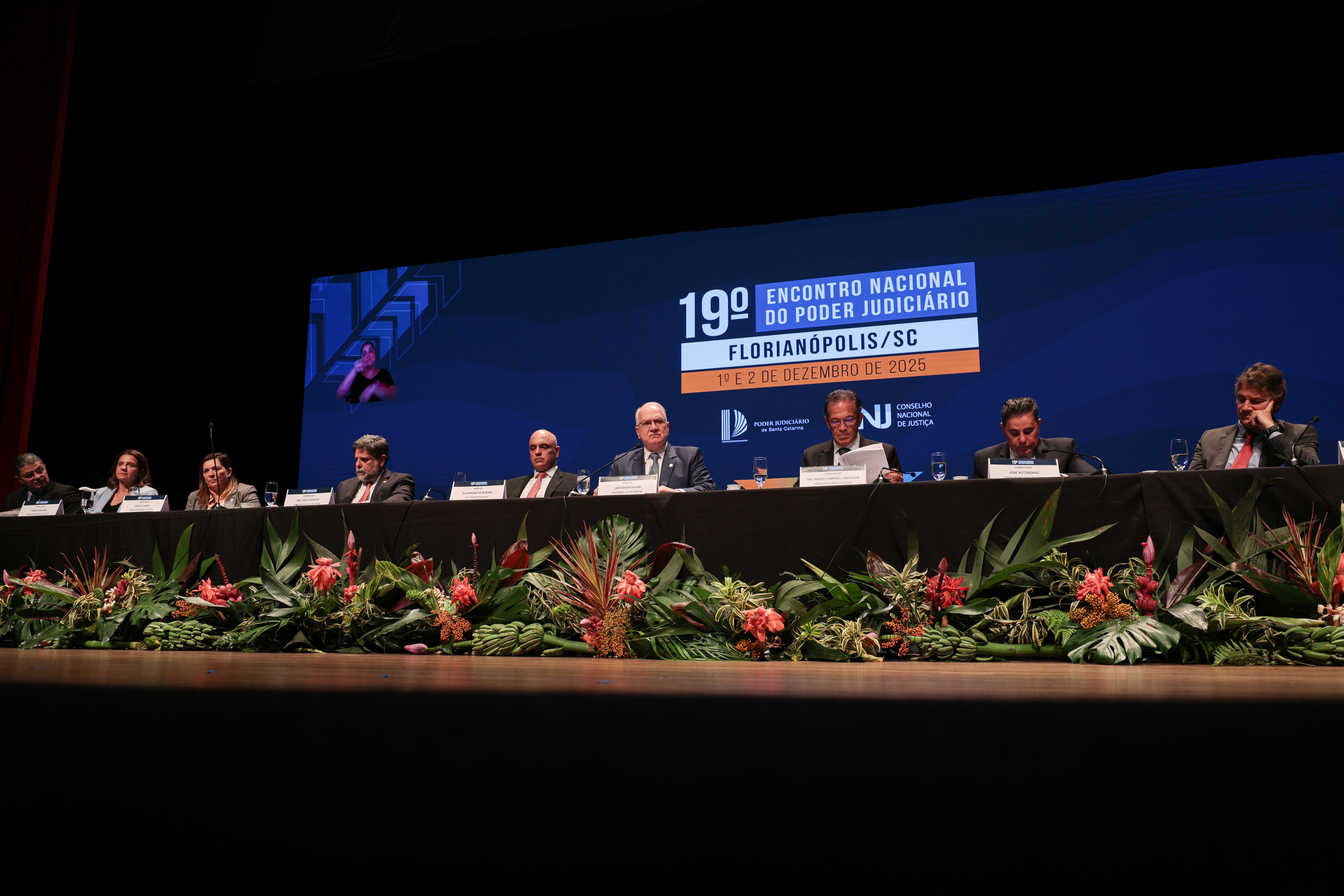 Mauricio Vieira / NCI TJSC Auditório lotado com plateia assistindo a uma mesa de autoridades no palco durante o 19º Encontro Nacional do Poder Judiciário, em Florianópolis (SC). Um grande telão ao fundo exibe a imagem de uma palestrante