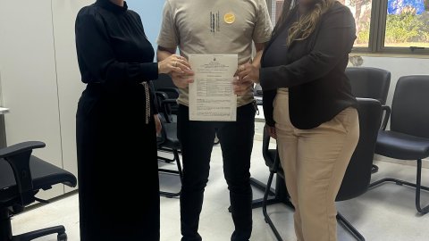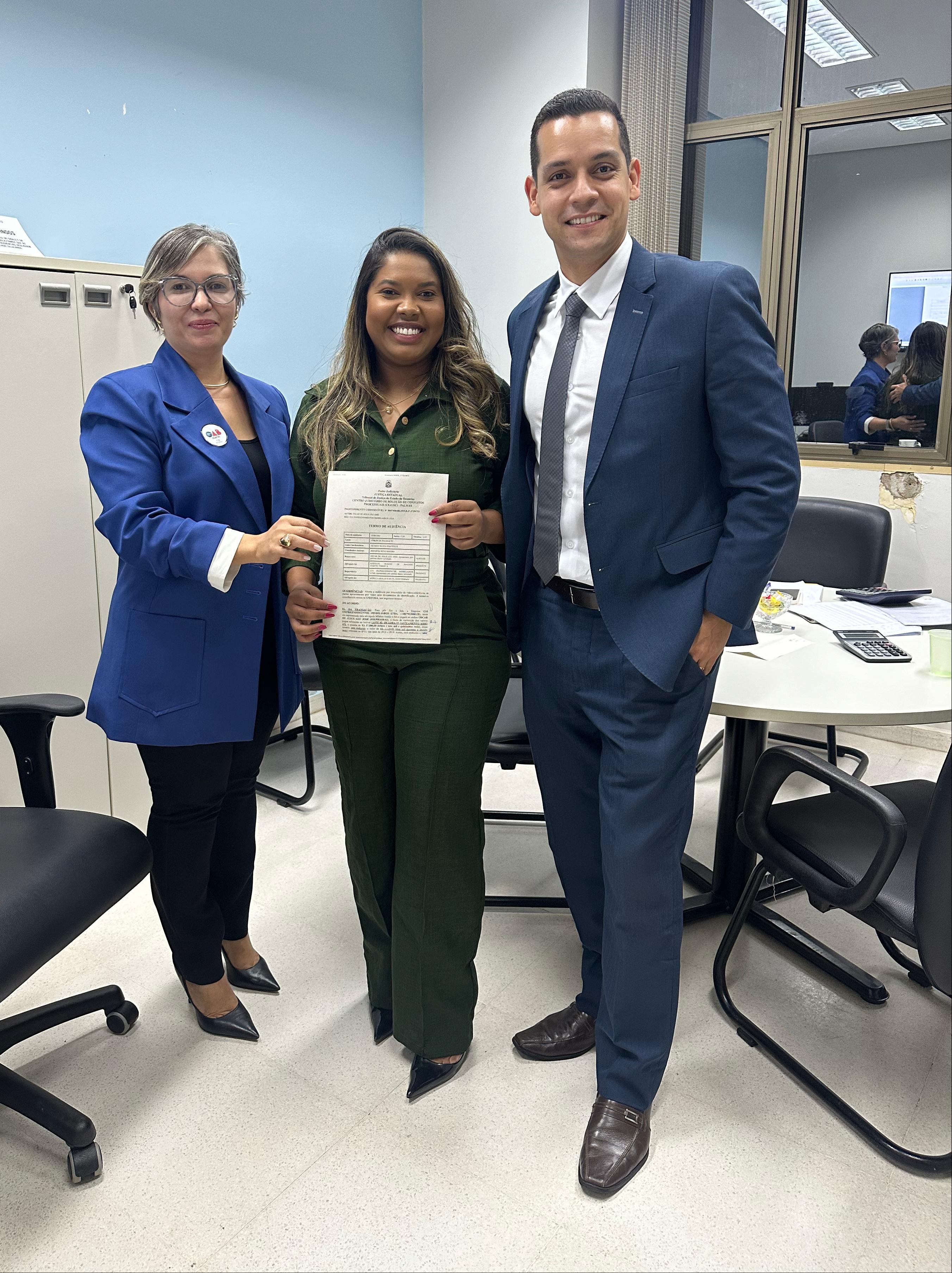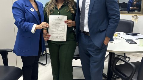 Divulgação Foto aberta em uma sala com três pessoas sentadas, da direita para esquerda, uma jovem mulher morena usando blazer branco, blusa escura e calça cor terra; uma mulher de cabelos curtos e grisalhos usando uma ropa estampada em tons de preto e branco e um homem de cabelos brancos, usando uma camisa azul, gravata estampada em tons de cinza e calça branca; todos estão sorrindo e os dois últimos pousando com um aperto de mãos