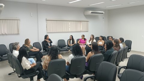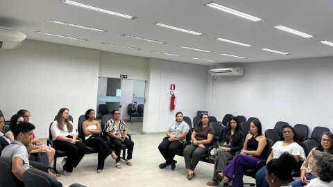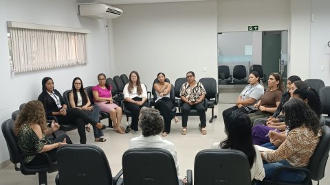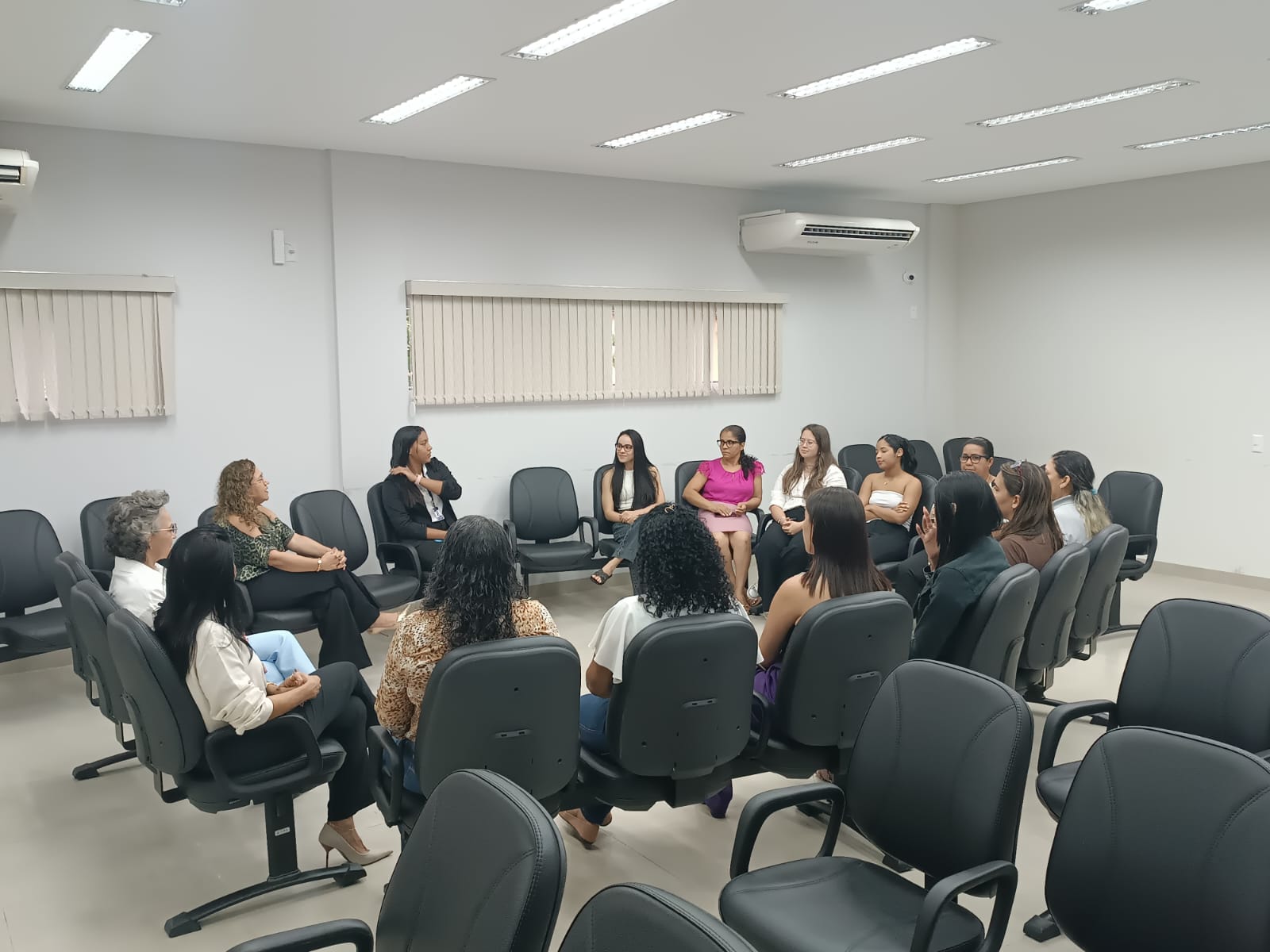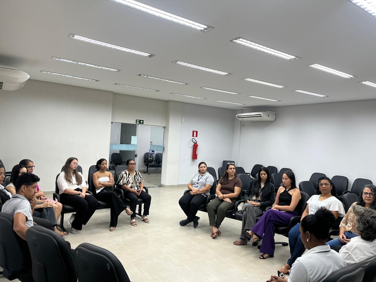 Divulgação NAPsi Servidoras participam de roda de conversa conduzida pela equipe do NAPsi na Comarca de Taguatinga. Sentadas em círculo, as participantes acompanham atentamente a exposição de uma das facilitadoras, em ambiente reservado, com cadeiras organizadas em formato colaborativo. O espaço conta com iluminação clara, ar-condicionado e porta de acesso ao fundo.