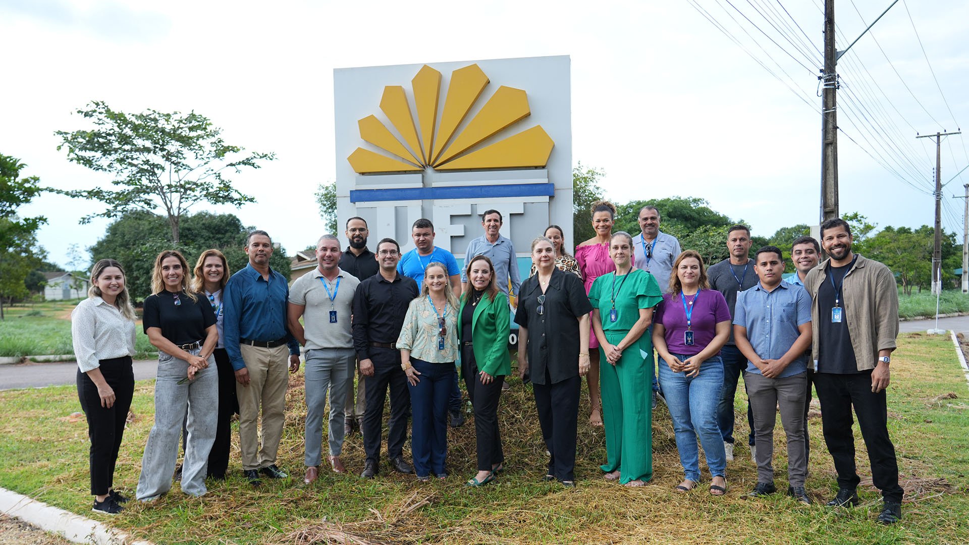 Rondinelli Ribeiro/Cecom/TJTO A imagem mostra um grupo de pessoas reunidas ao ar livre, na Universidade Federal do Tocantins (UFT), durante uma ação do projeto Plantar para ComPENSAR do TJTO. À frente, a árvore recém-plantada simboliza o compromisso coletivo com a sustentabilidade e a preservação ambiental.