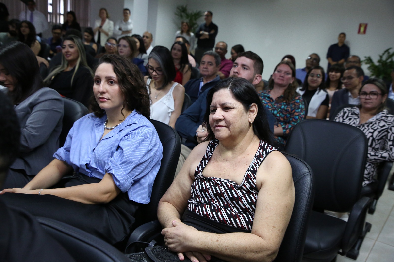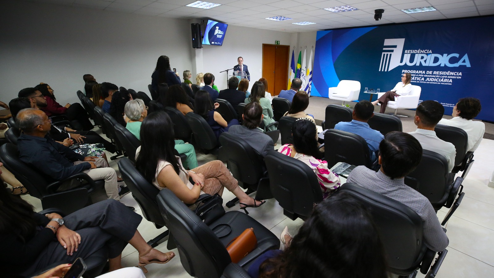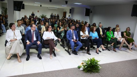 Hodirley Canguçu/Esmat A imagem mostra um auditório cheio, com autoridades e público sentados em cadeiras organizadas, acompanhando a certificação da Turma III do Programa de Residência em Prática Jurídica. O ambiente é interno, formal, com telões laterais, iluminação clara e um arranjo floral à frente do espaço.