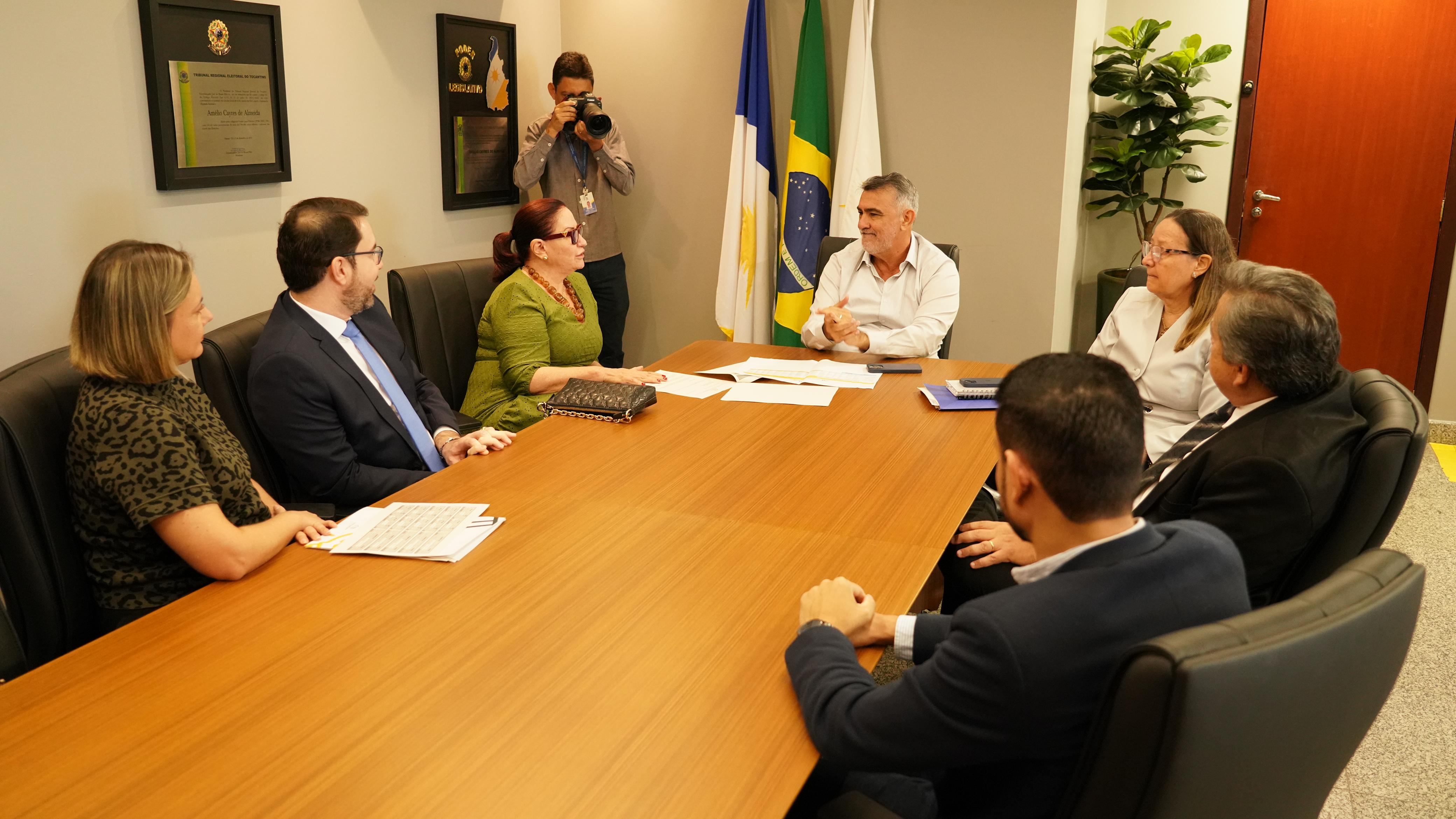 Fotos: Rondinelli Ribeiro Desembargadora Etelvina Maria Sampaio e demais integrantes do Poder Judiciário do Tocantins reunidos com o presidente da Assembleia Legislativa; eles estão sentado em uma mesa grande de reuniões, ao fundo uma porta de madeira e um conjunto de bandeiras do Tocantins, Brasil e  outra que não dá ara identificar