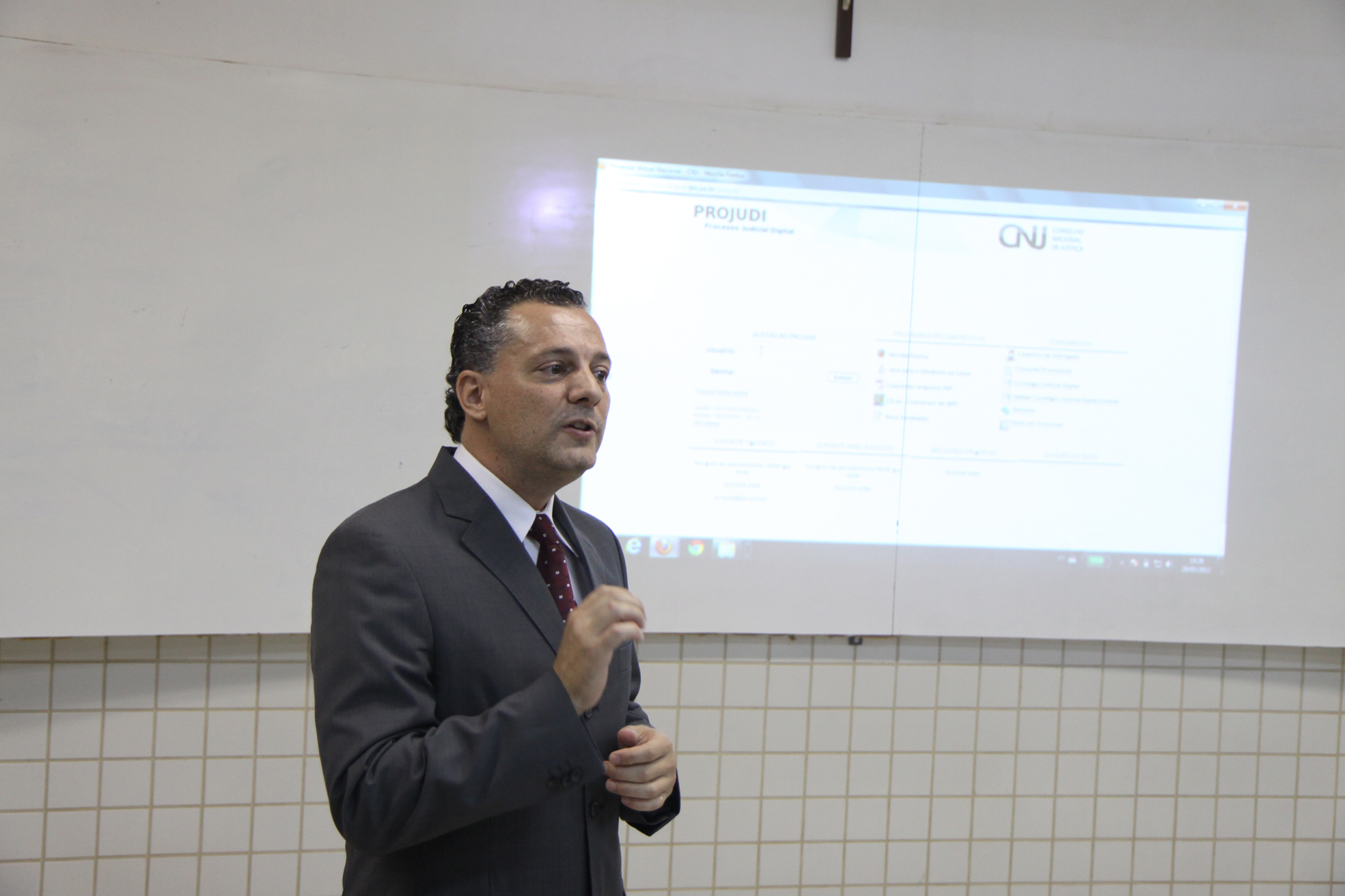 O Juiz Marcelo Faccioni, Titular do Juizado Especial, atual Juiz Eleitoral da 29ª Eleitoral de Palmas e Coordenador de Implantação do Sistema Virtual no Tocantins, apresenta aos alunos um paralelo entre o processo eletrônico e o físico, os benefícios e as vantagens com a virtualização, tanto para os operadores do Direito, quanto para toda sociedade. O magistrado aborda, inclusive, as diretrizes da Lei 1419, de 16 de dezembro de 2006, que dispõe sobre a informatização do processo judicial; altera a Lei no 5.869, de 11 de janeiro de 1973 – Código de Processo Civil; e dá outras providências.