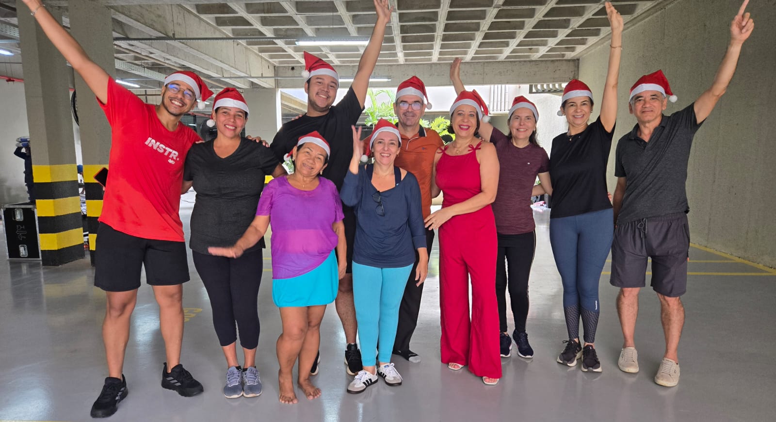 Nesta terça-feira, a turma de Pilates Terapêutico realizou a última aula de 2025. Com gorros de Papai Noel, os(as) alunos(as) finalizaram as atividades com uma confraternização.