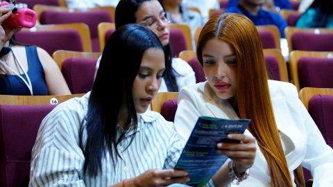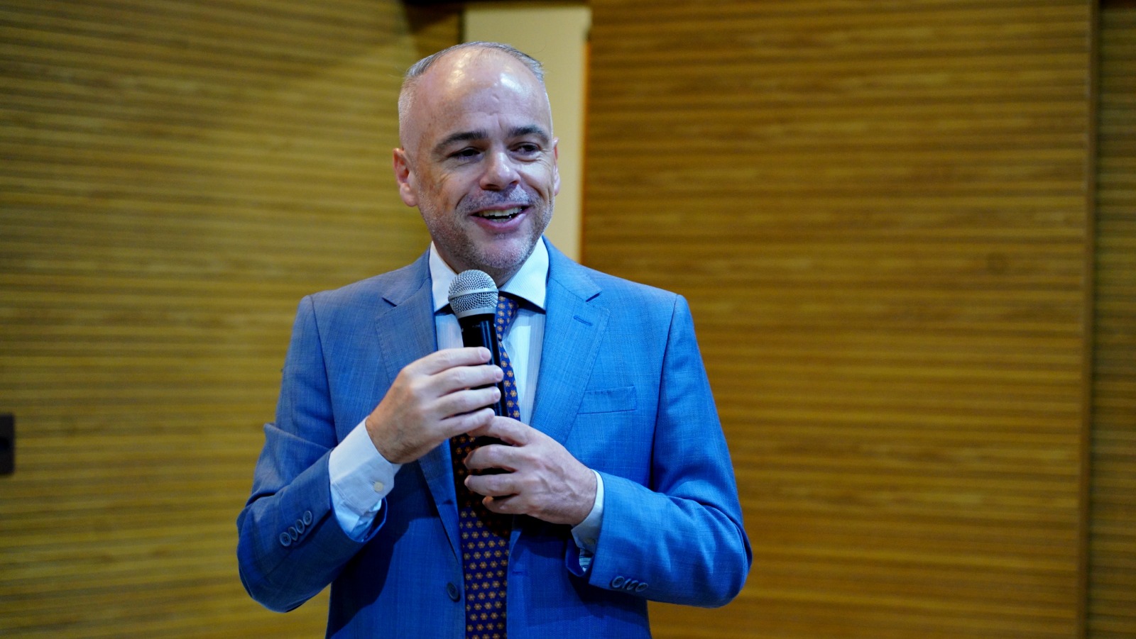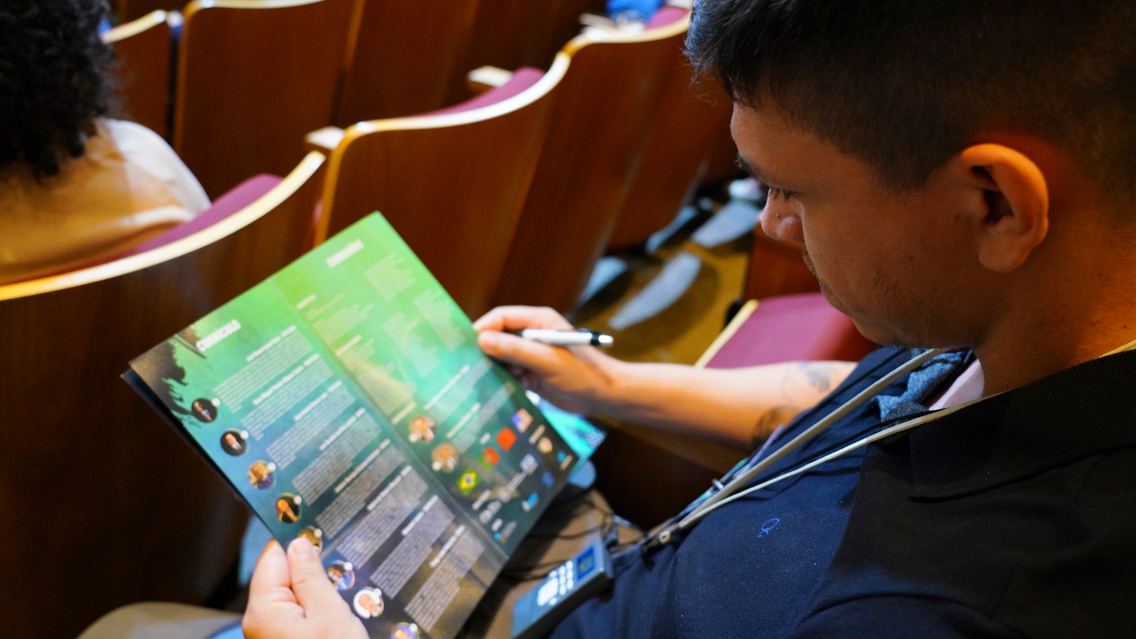 Ednan Cavalcanti Fotografia colorida onde a câmera está no meio de um corredor, e dos dois lados estão pessoas sentadas em cadeiras. Na frente, está um palco com uma tela de fundo e três homens sentados na frente. Eles estão em um auditório coberto de madeira clara