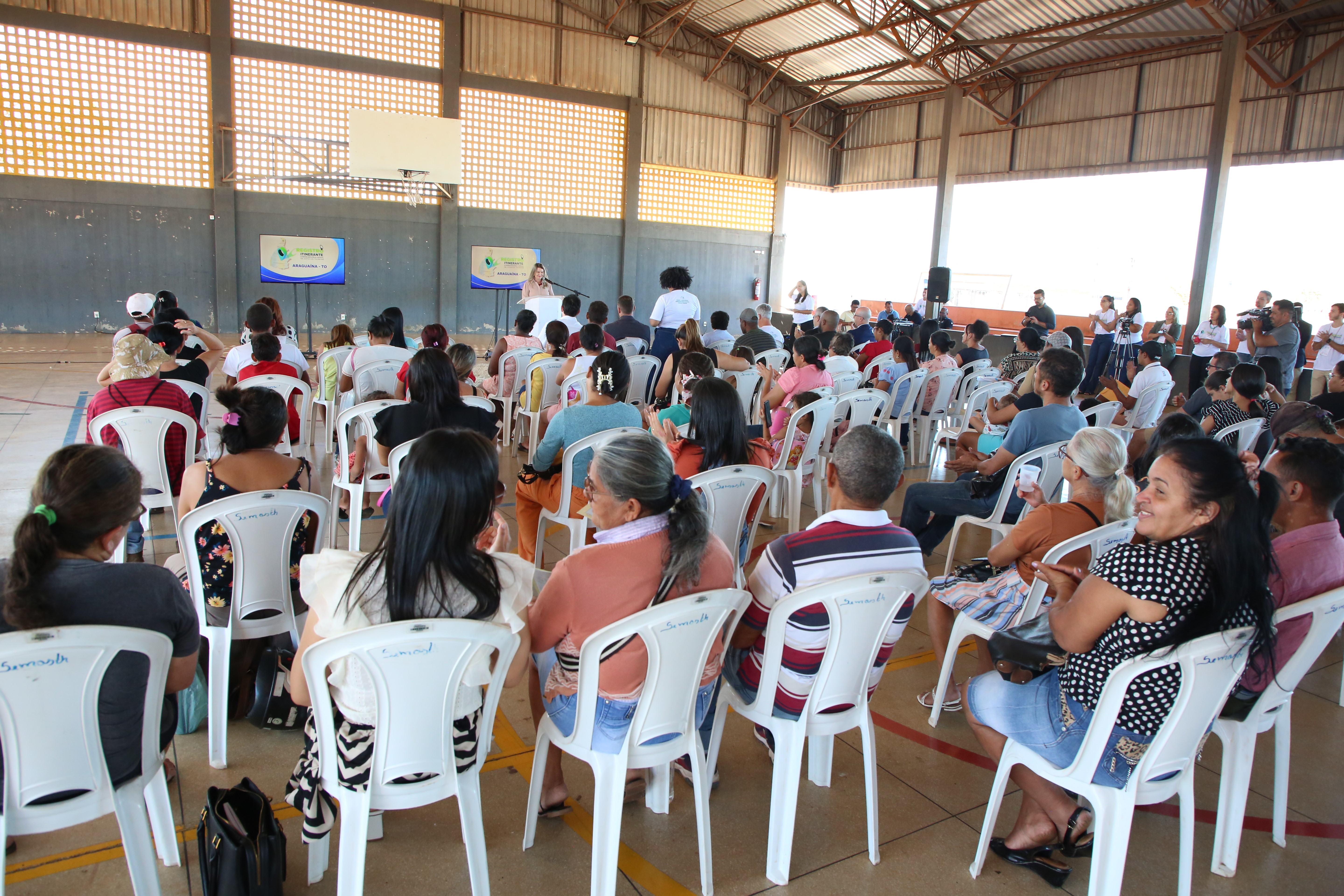 A solenidade de abertura do projeto em Araguaína foi realizada pela manhã e contou com a participação dos parceiros do projeto - diretoria do Fórum da Comarca de Araguaína, Cejusc, Serviço de Registro Civil das Pessoas Naturais, Interdições e Tutelas de Araguaína, Prefeitura Municipal, Defensoria Pública do Estado e Ministério Público Estadual.