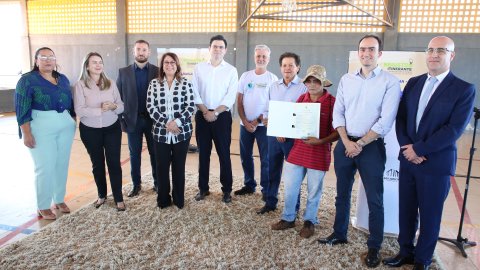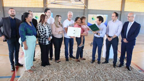 Hodirley Canguçu dois homens posam para fotografia. cada um deles segura um documento. entre eles uma mulher segura uma criança no colo