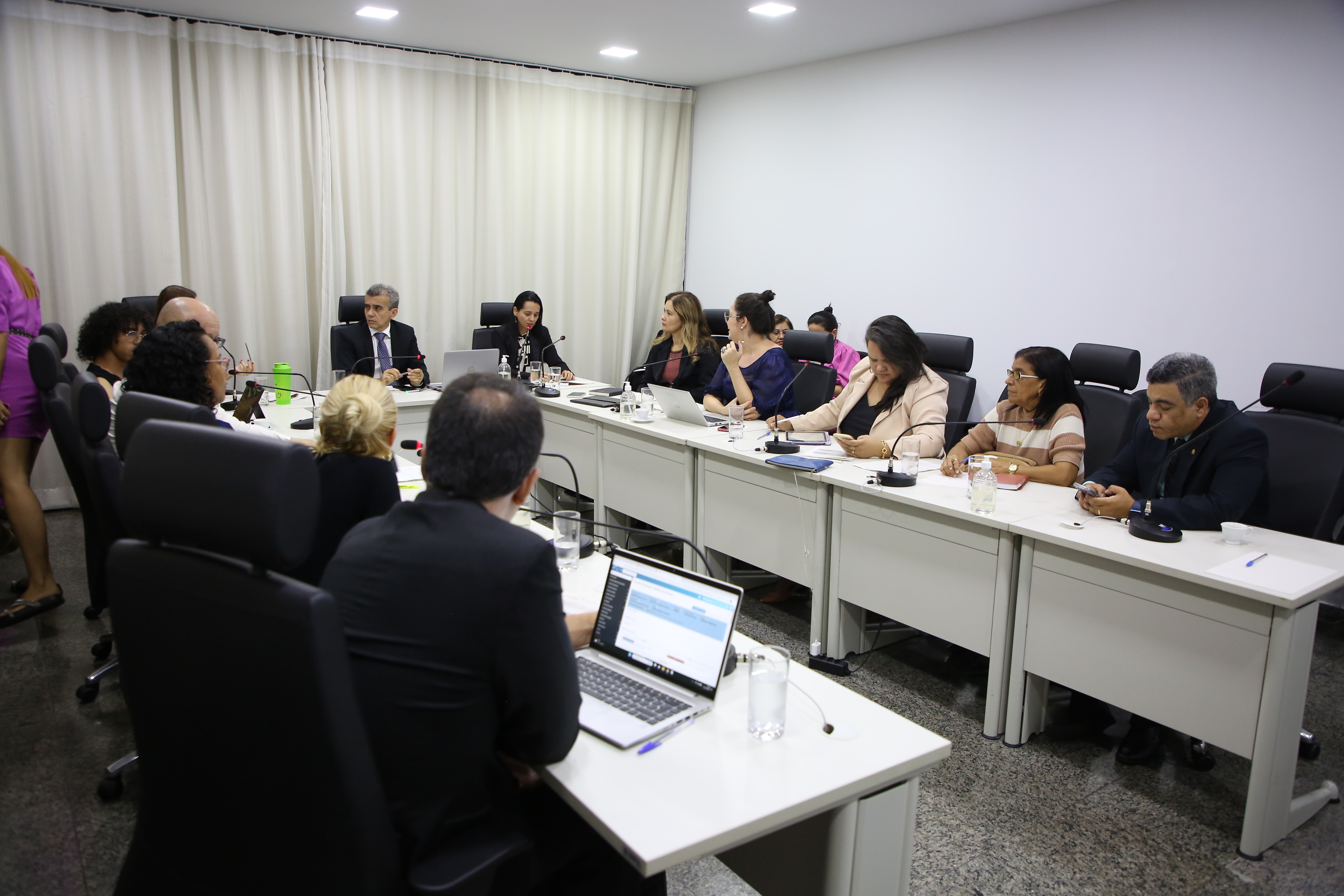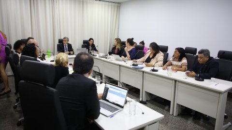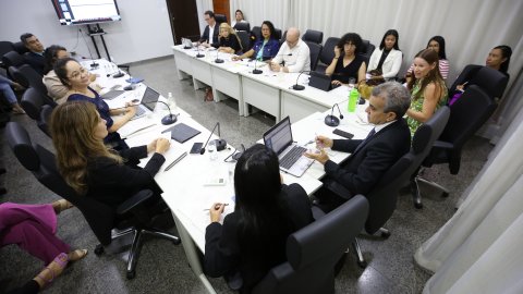 Fotografia colorida de juiz ouvindo pessoas durante uma reunião (ele usa terno e gravata e tem um microfone à frente) Além disso, é necessário uma rede de apoio para assegurar dignidade e autonomia a estas pessoas. A criação de uma Equipe de Atenção Primária (EAP), formada por psiquiatra, psicólogo, enfermeiro, assistente social e terapeuta ocupacional que servirá de suporte ao Judiciário para atuação em todo o estado, nos termos da Portaria nº 94/2014 do Ministério da Saúde foi uma das pautas também.