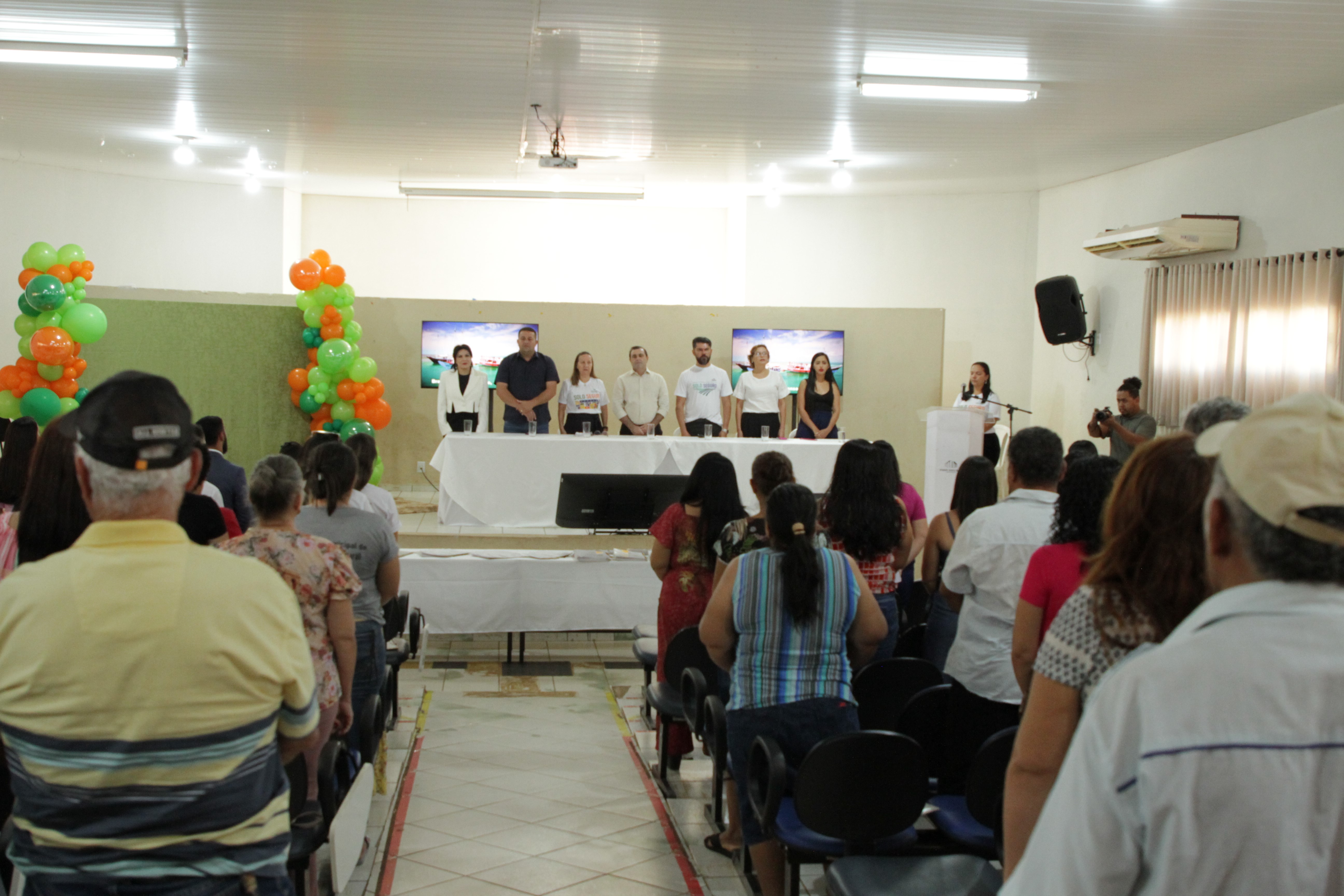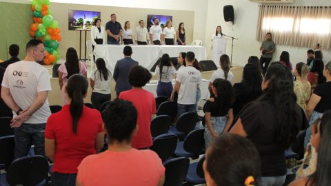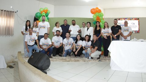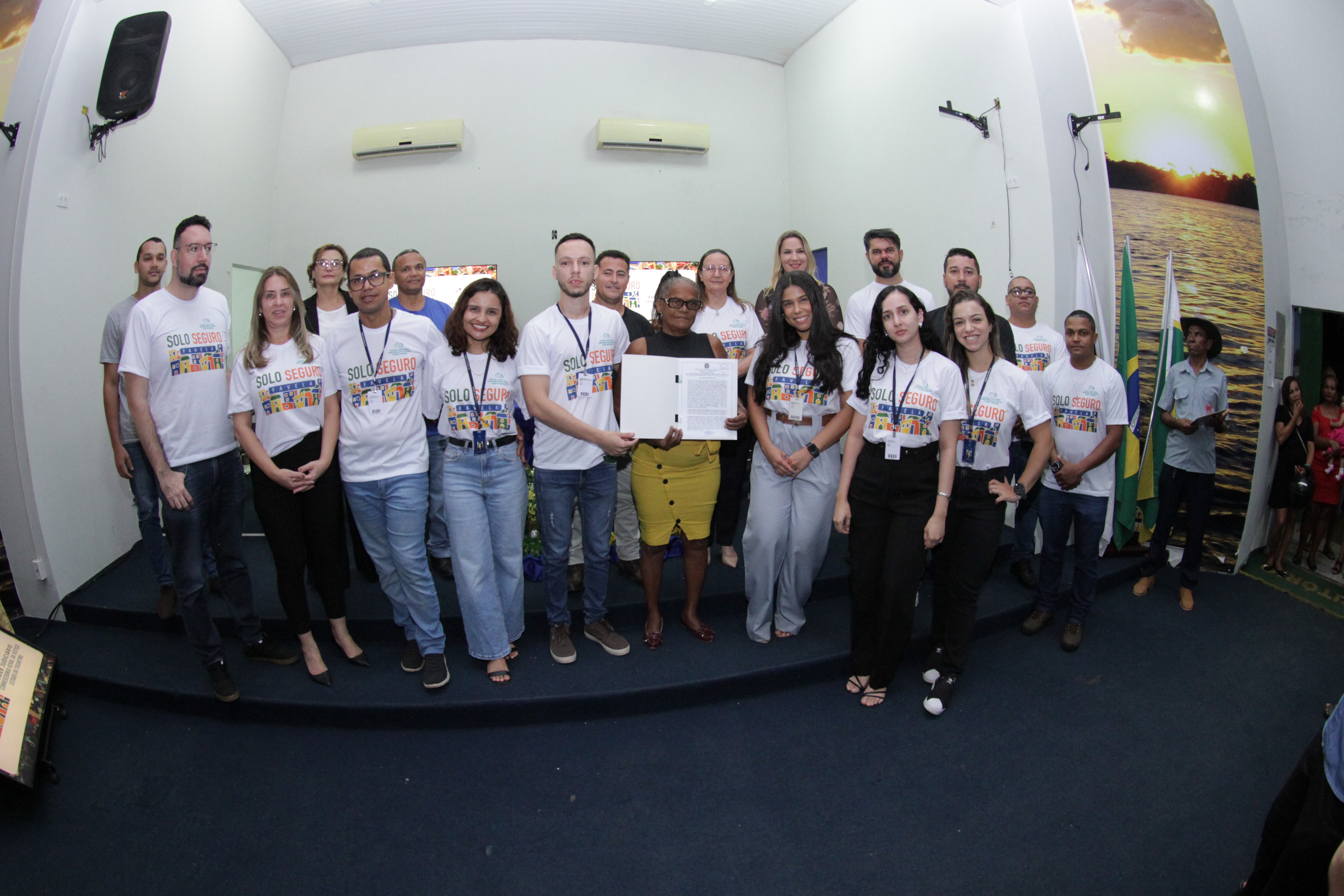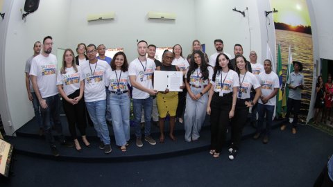 Lucas Nascimento Fotografia colorida onde um grande grupo de pessoas está posando para foto em um auditório. As da frente estão segurando documentos e mostrando eles para a câmera