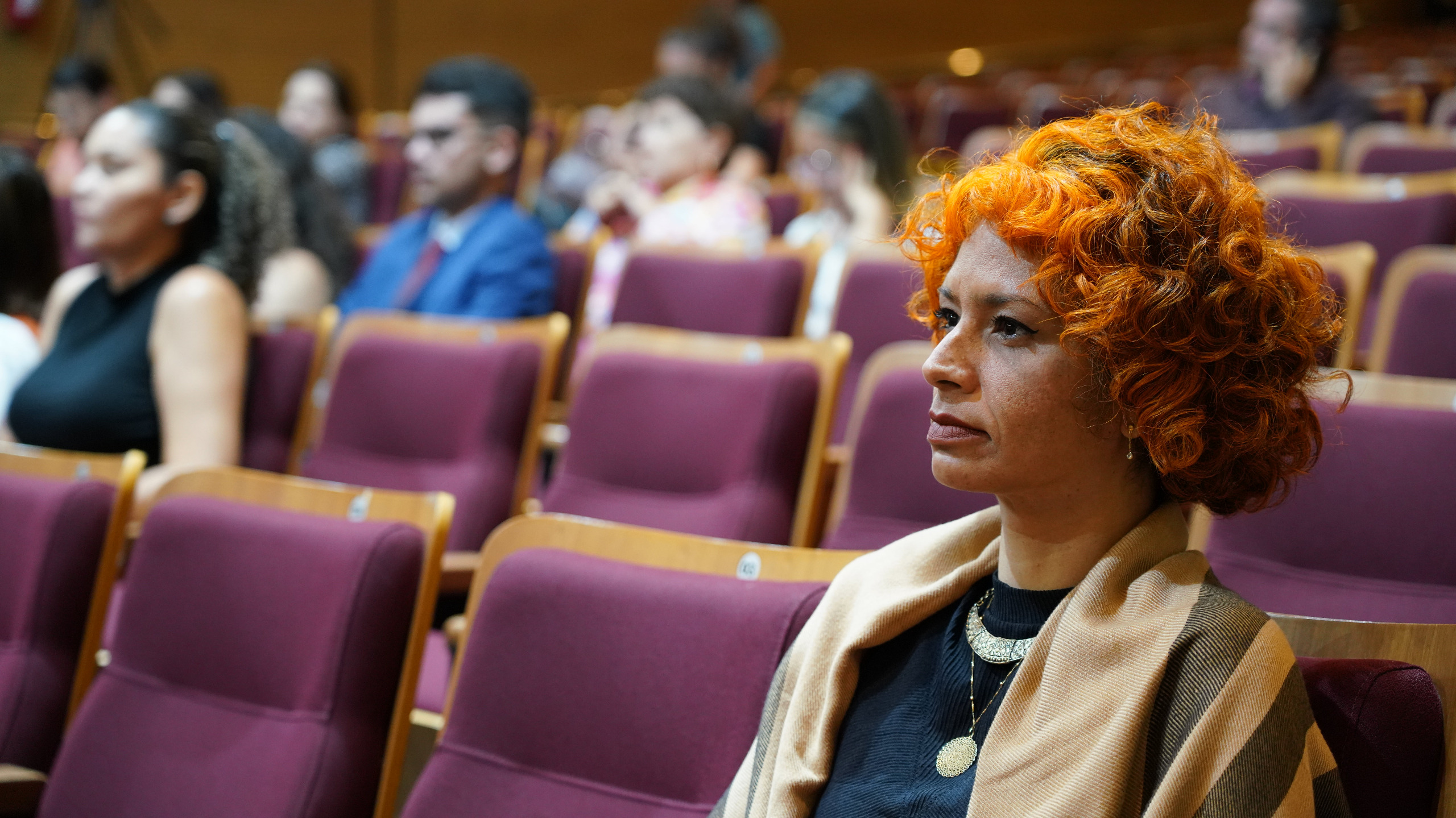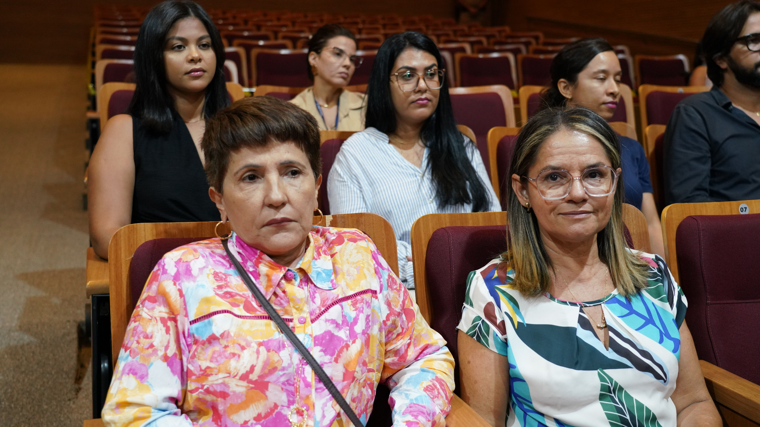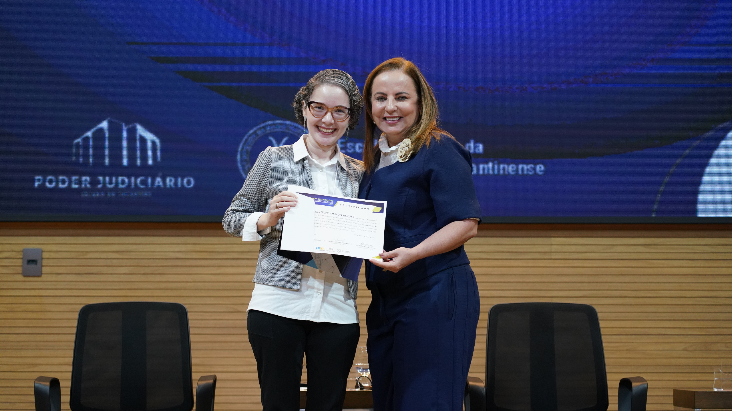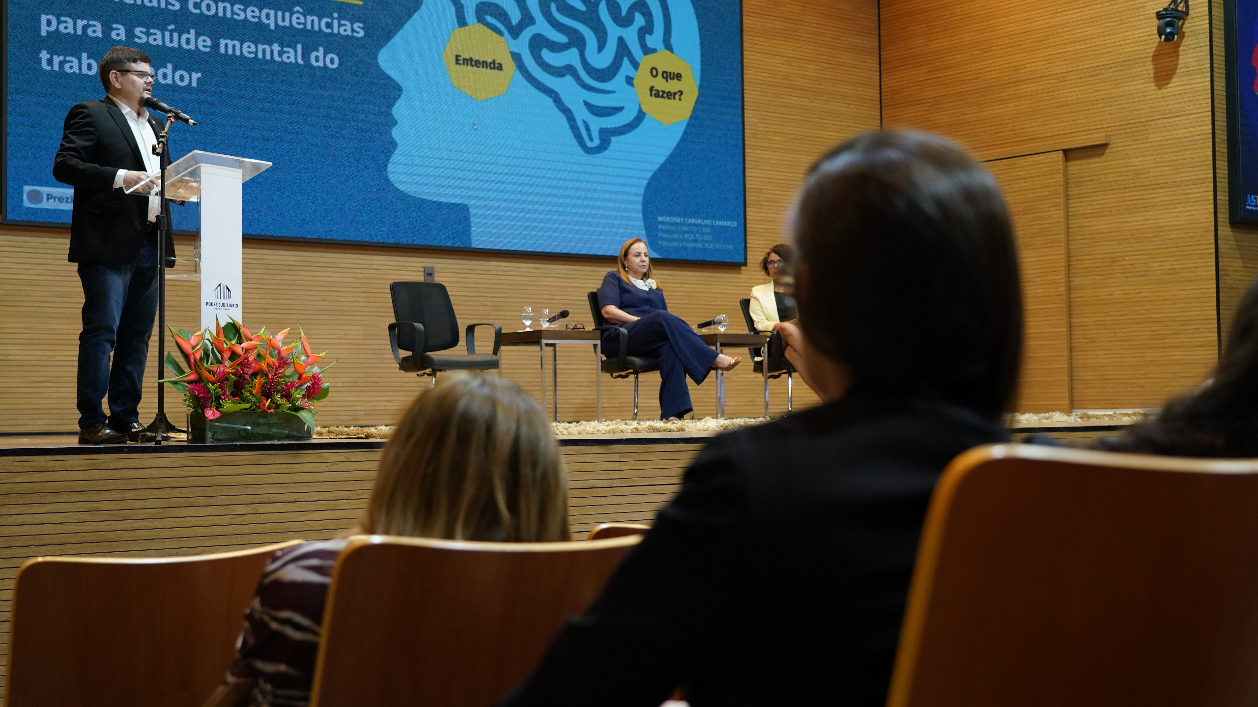 Rondinelli Ribeiro (TJTO) Auditório do Tribunal de Justiça do Tocantins, com várias cadeiras de madeira e algumas pessoas assistindo a palestra de costas para a foto, no final da foto tem um telão com o slide da apresentação da palestra, tem três cadeiras pretas, mas apenas duas mulheres estão sentadas, uma estar com vestido preto e blazer amarelo claro e a outra estar sentada ao lado com macacão azul escuro, e em pé falando no púlpito estar uma outra mulher  com blazer cinza.