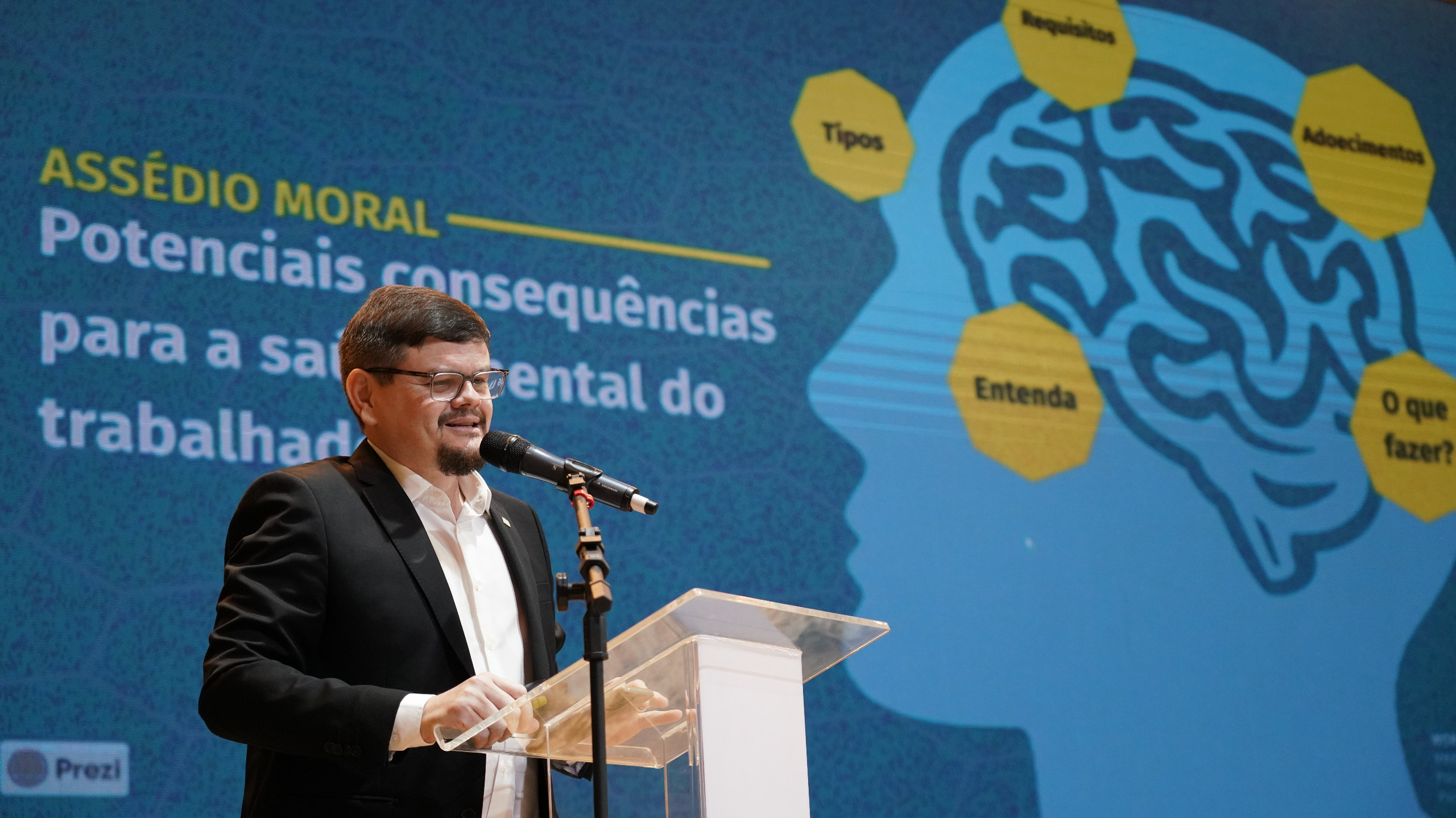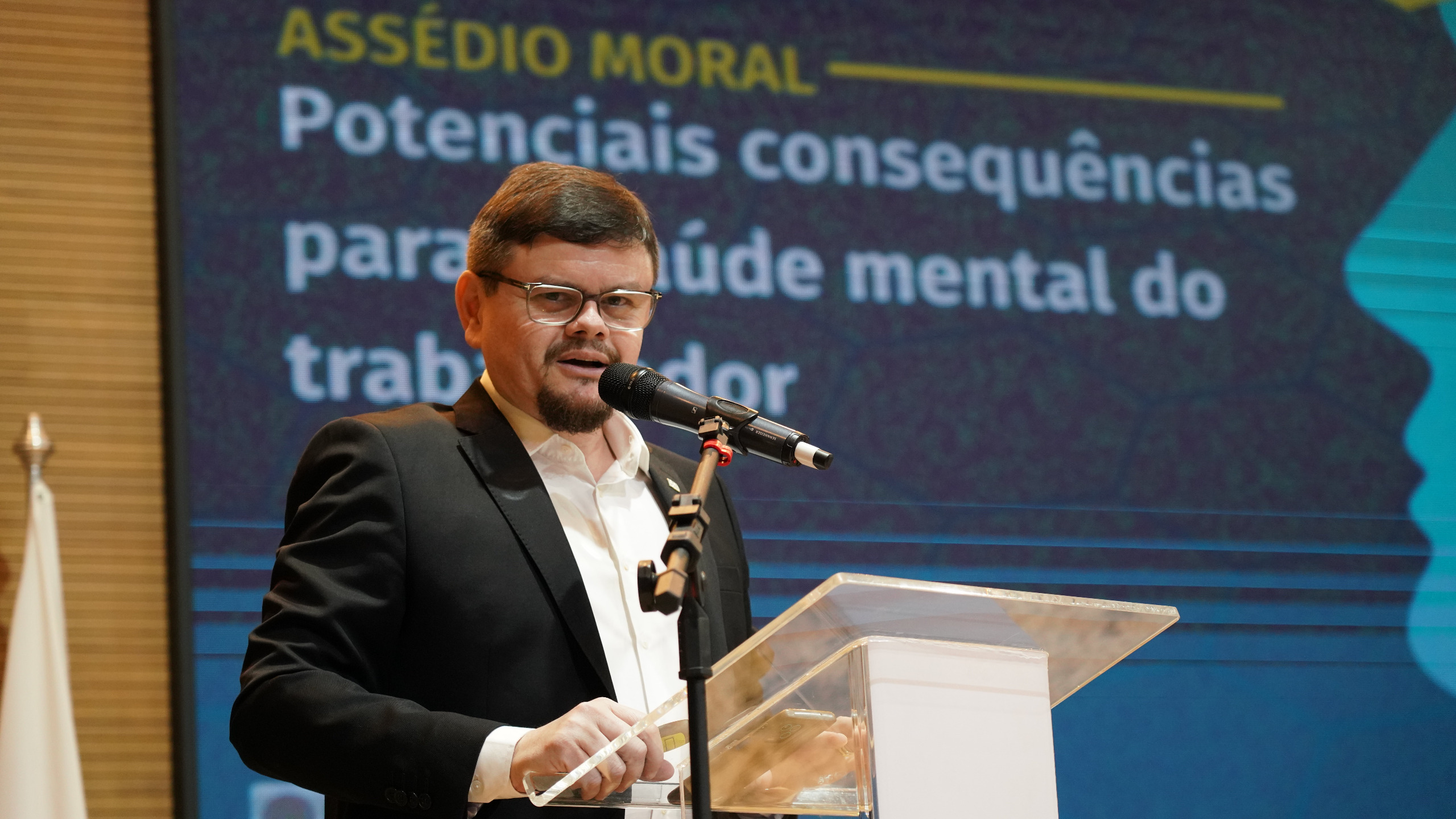 A segunda palestra do painel teve como tema “potenciais consequências negativas do assédio moral para a saúde mental do trabalhador”, com os apontamentos do palestrante Wordney Carvalho Camarço, psiquiatra forense e médico psiquiatra do Núcleo de Acolhimento e Acompanhamento Psicossocial – NAPsi, que cativou o público com muitos exemplos de sua experiência clínica.